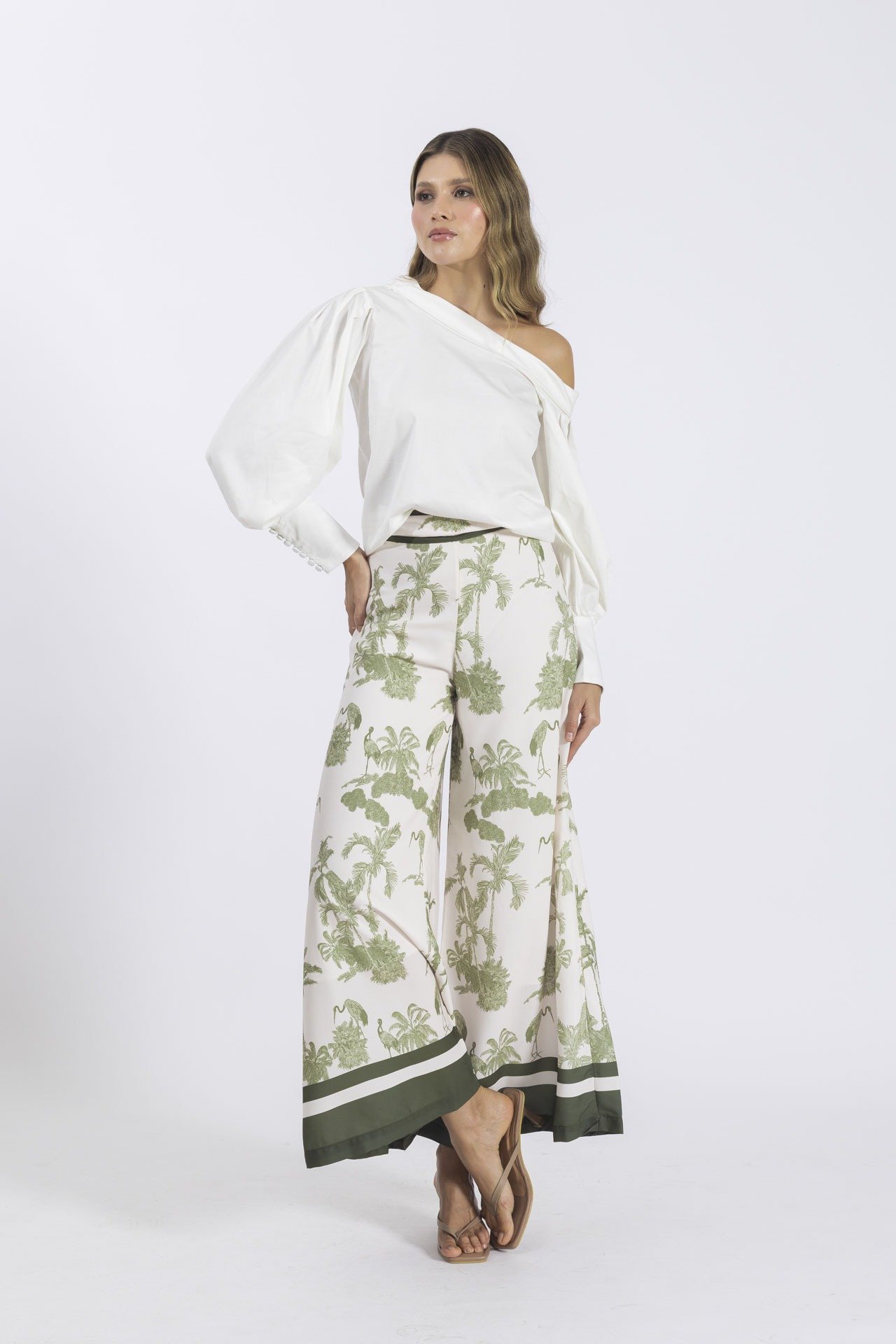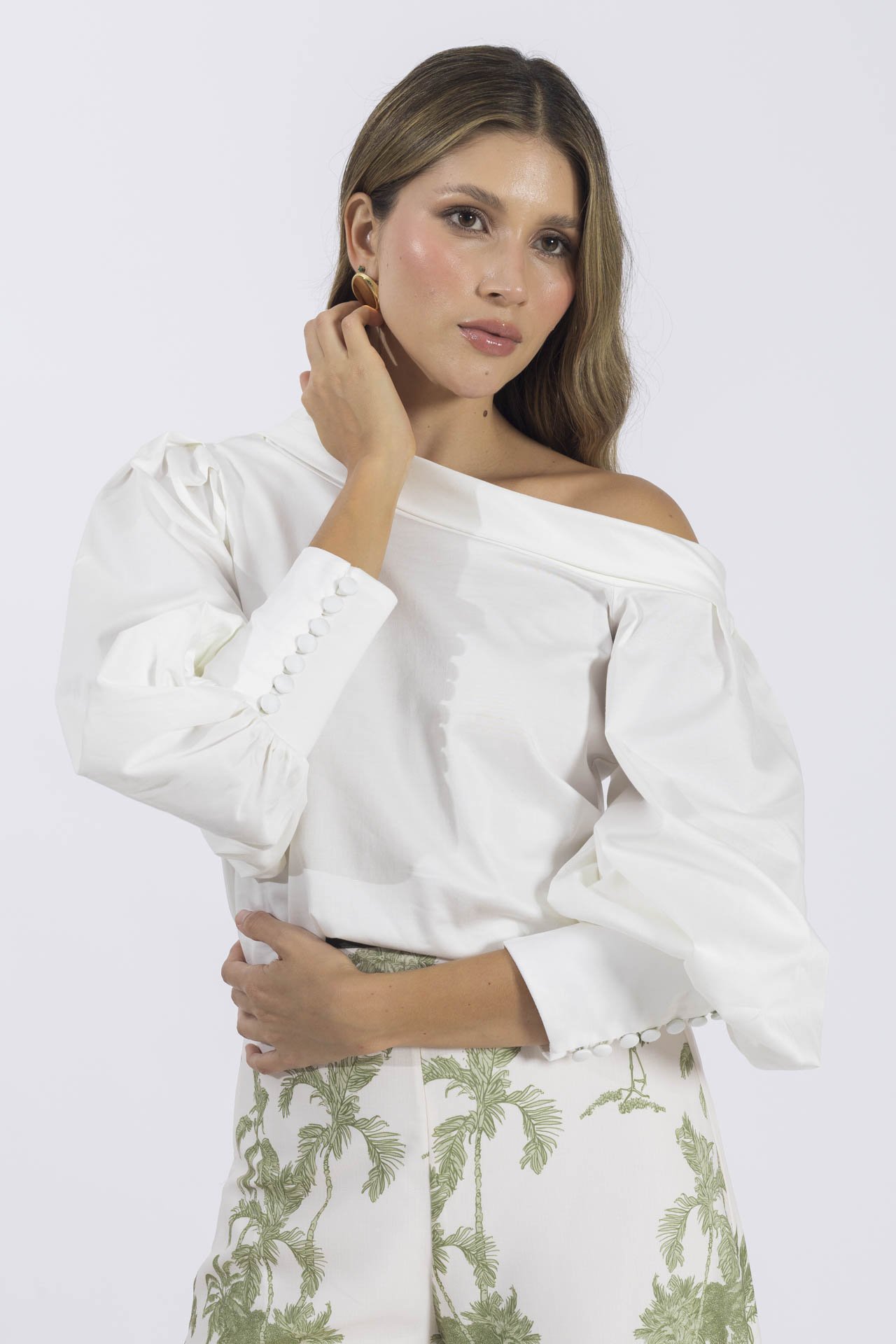 La blusa Dalila se caracteriza por su escote tipo bandeja y mangas largas abullonadas con delicados botones forrados que aportan un toque clásico y femenino. Su silueta sencilla la convierte en una prenda versátil, perfecta para crear desde un look casual hasta un atuendo formal de oficina.