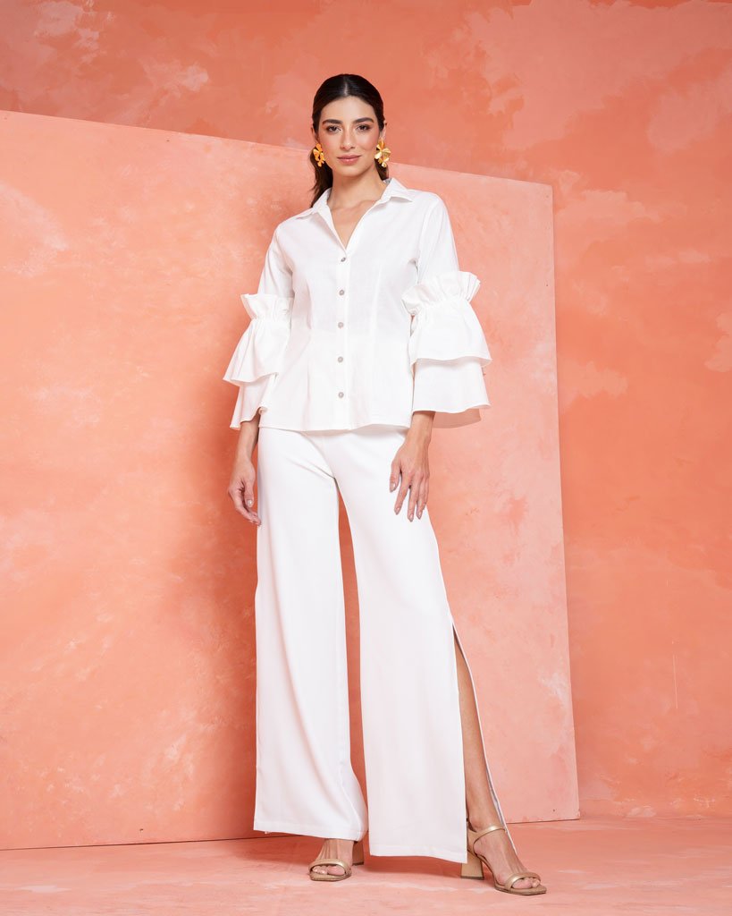 Nuestra blusa Milu llega para llenar tu armario de estilo. Sus mangas puff le añaden dramatismo a tu look para que pases de casual a formal con un cambio de accesorios. Combínala con nuestro pantalón Laurent y crea un clásico outfit de oficina o ponle una falda de seda para esa cena con tus amigas, o lúcelo con tu jean favorito para tus días más relajados. Elaborada en lino rayón.