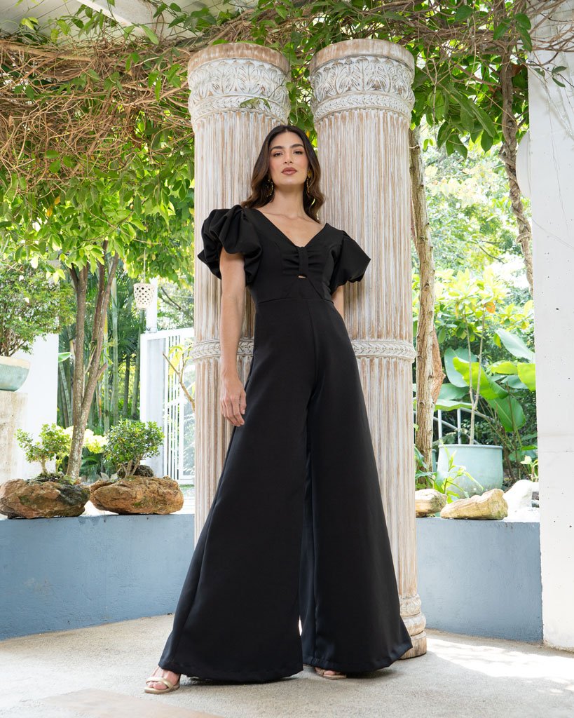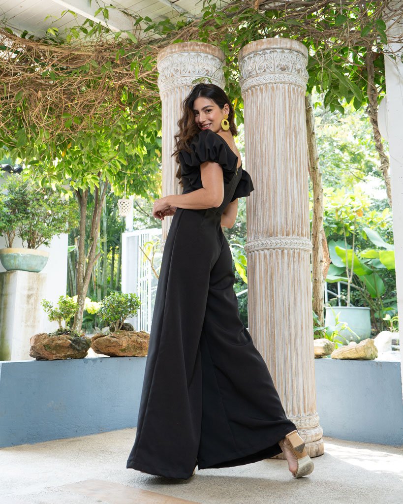 Enterizo elaborado en lino noche de Venecia, manga puffy, con pantalón palazo y cremallera en el centro de la espalda.