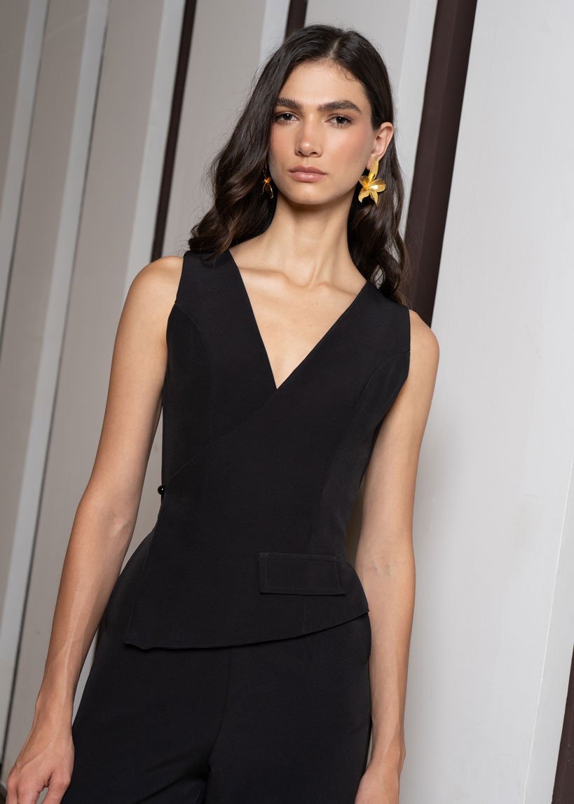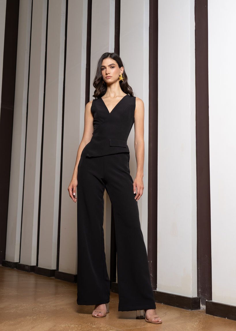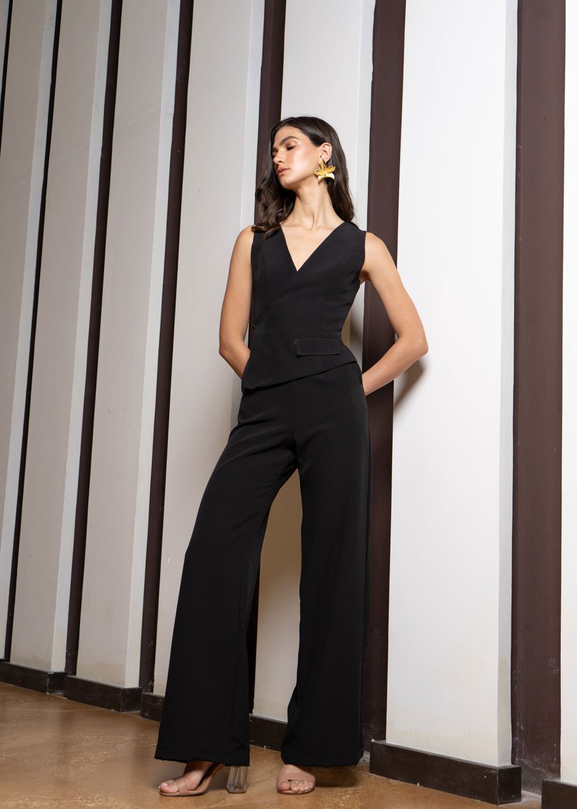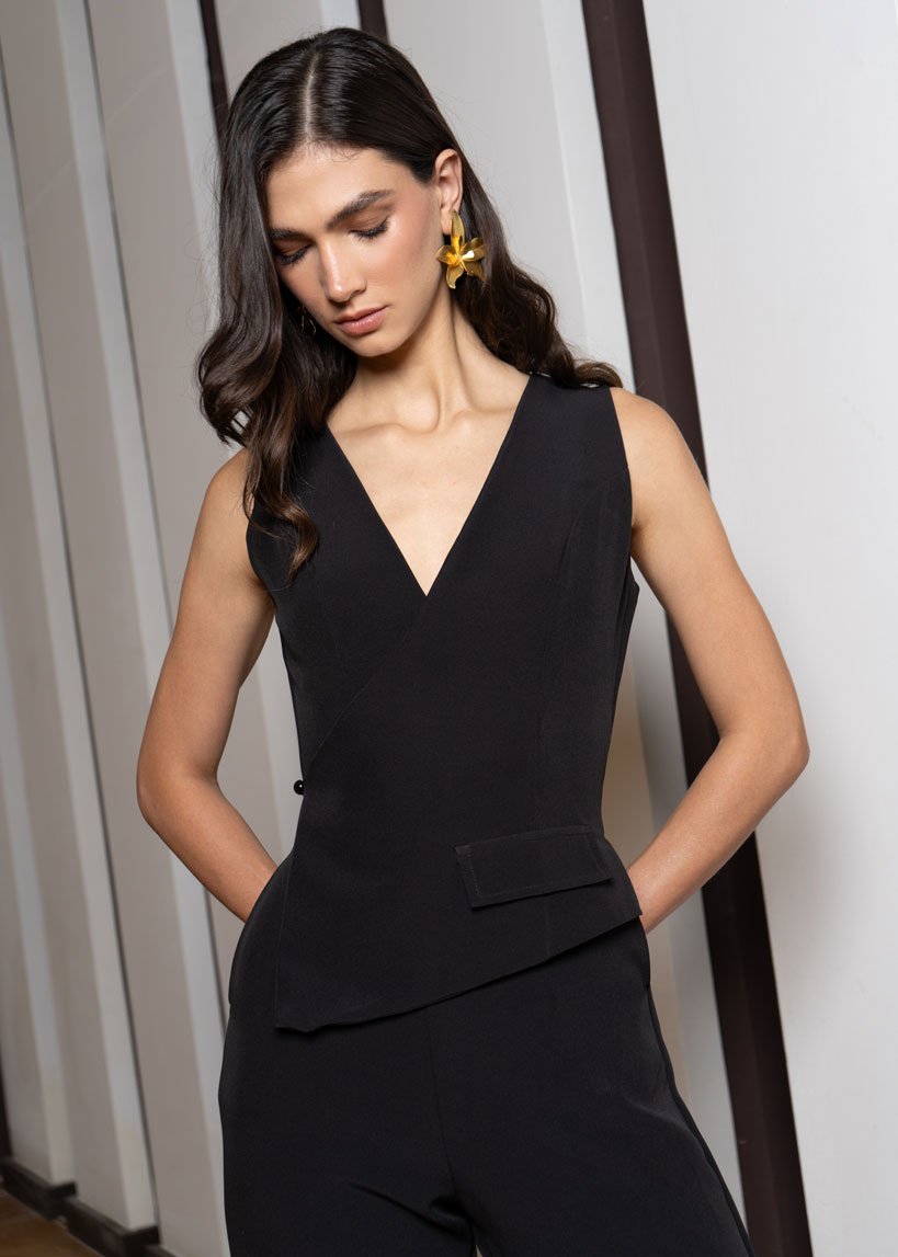 Enterizo tipo chaleco cruzado al lateral con botón, corte de pantalón recto, espalda con cremallera central y ribetes en pantalón.