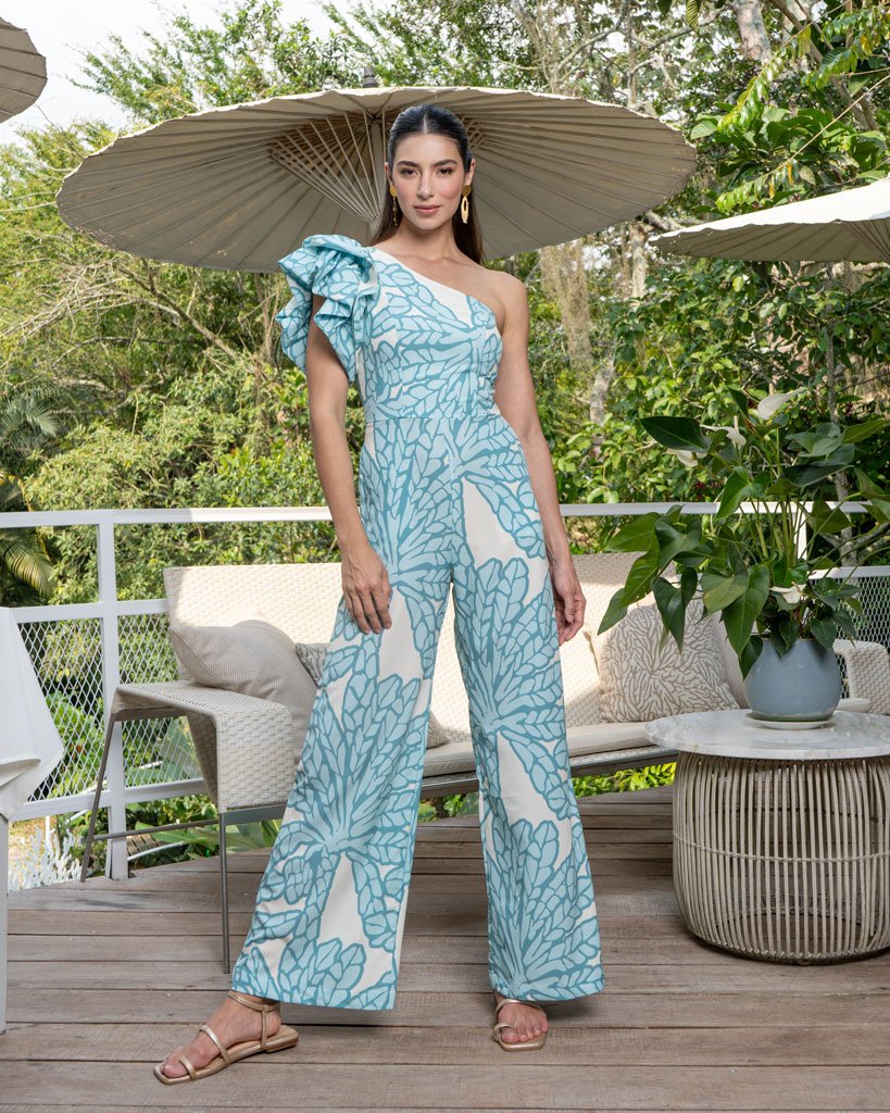 Elaborado en seda estudio mate, escote medio beso con manga puffy, pantalón de corte recto y cremallera en el centro de la espalda.