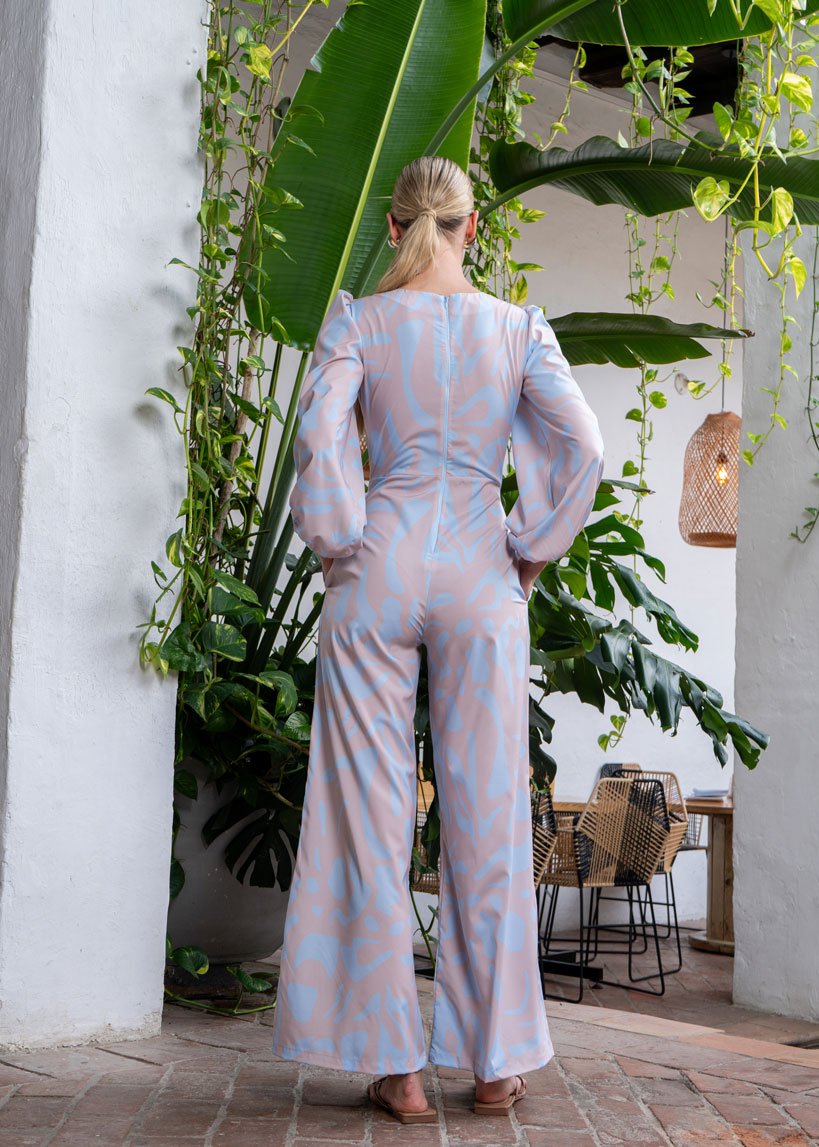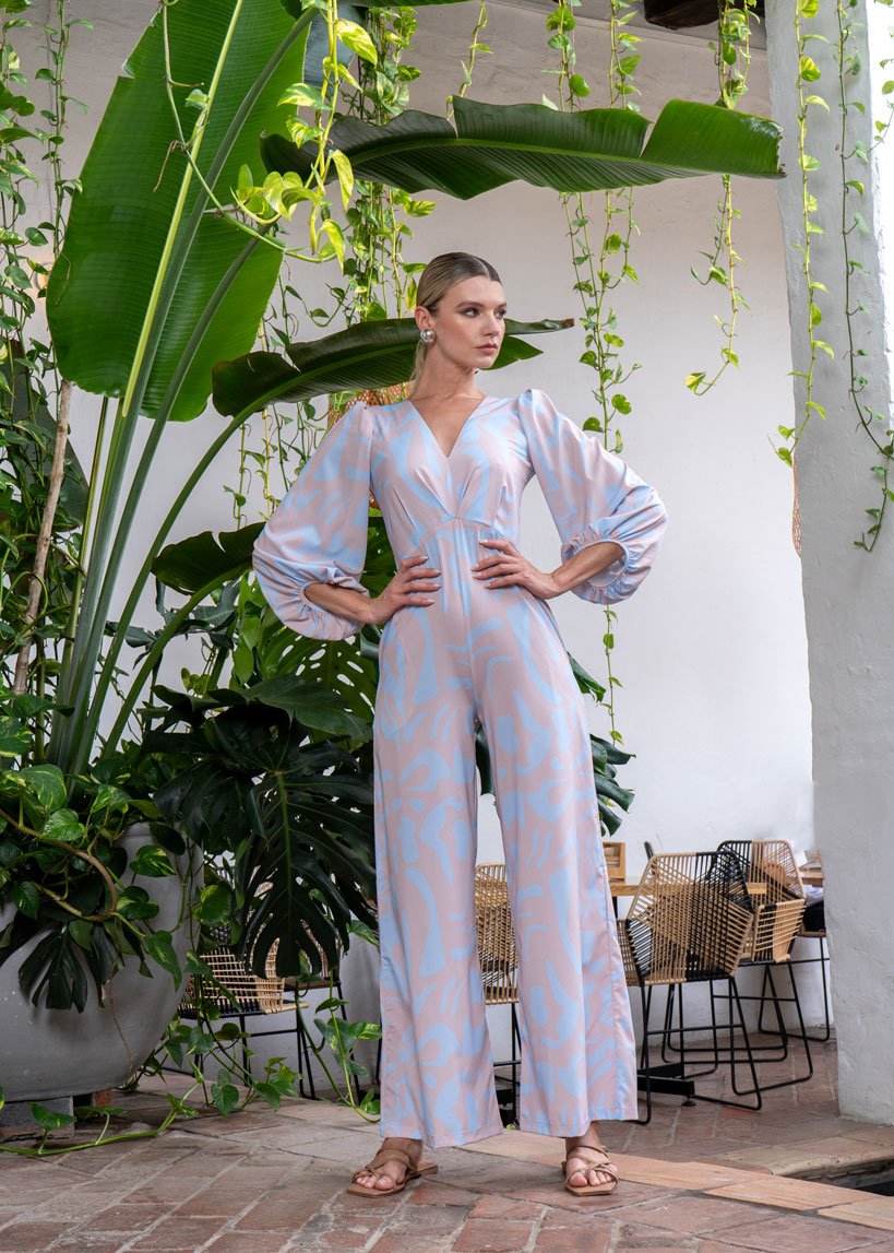 Enterizo elaborado en seda estudio mate, manga recogida, escote en v con pliegues delanteros, pantalón de corte recto y cremallera en el centro de la espalda.