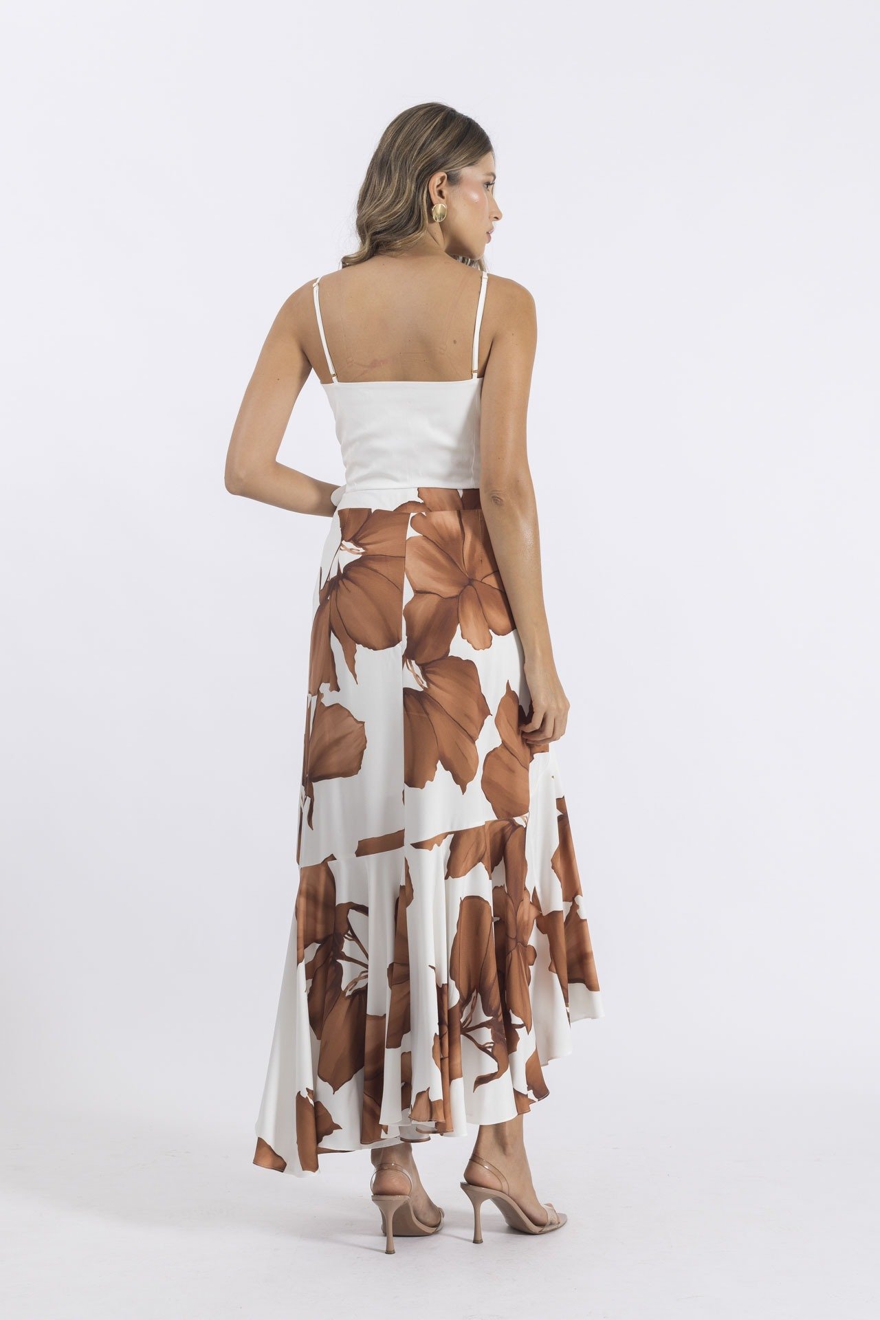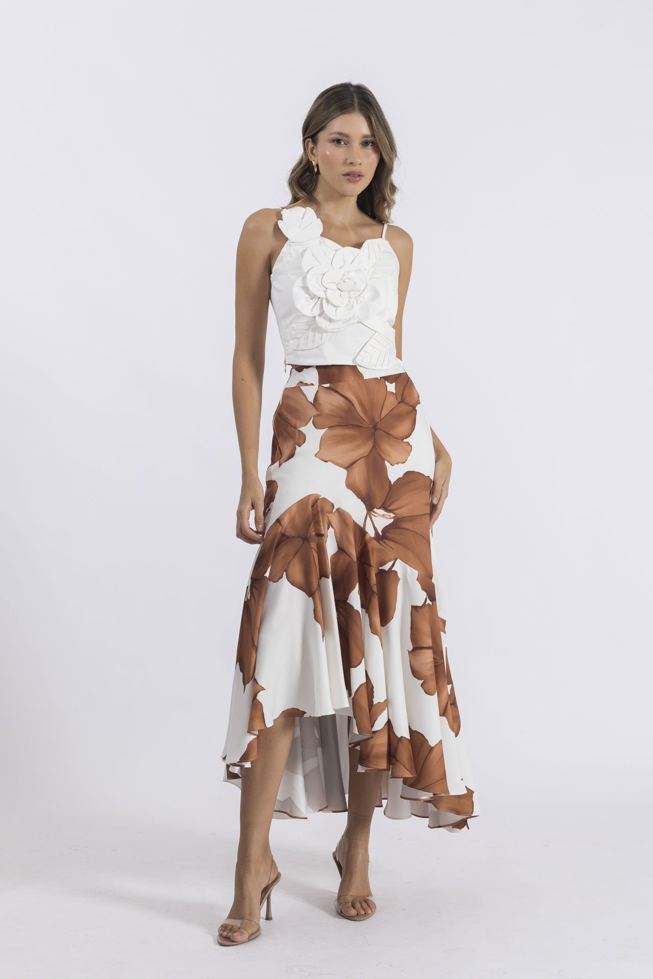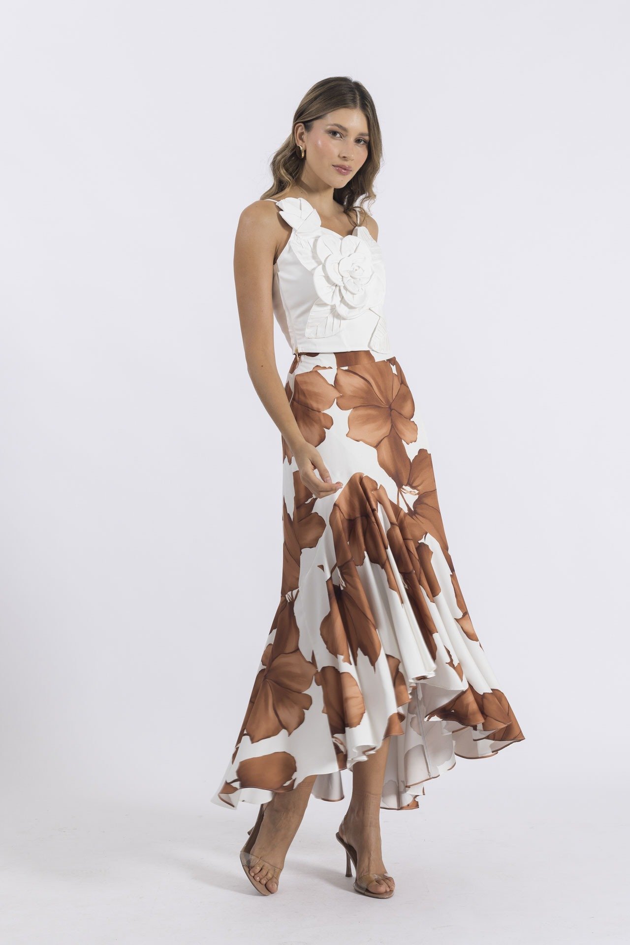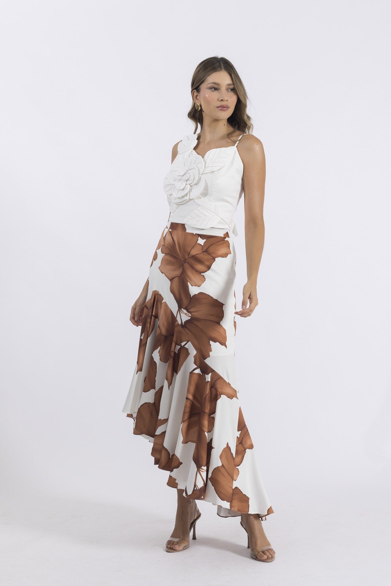 La silueta fluida y dinámica hace que cada paso sea una declaración de estilo, mientras la asimetría del diseño agrega un toque atrevido sin perder la elegancia. Este look es ideal para quienes buscan una pieza que combine la suavidad y el movimiento con la potencia de un diseño único y contemporáneo. Una falda que se convierte en el centro de atención de cualquier evento.