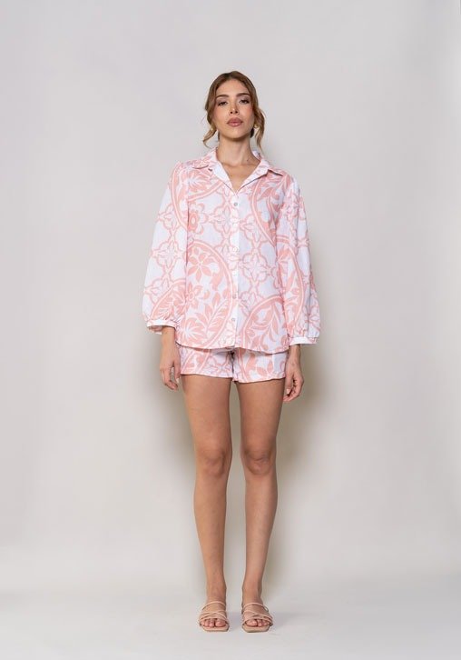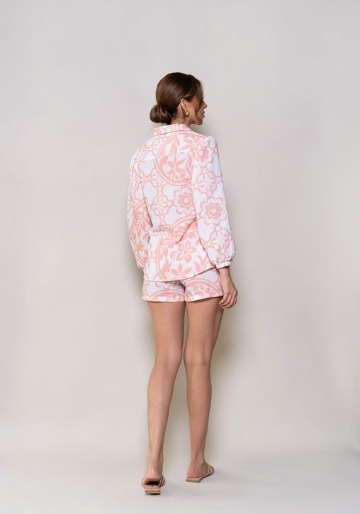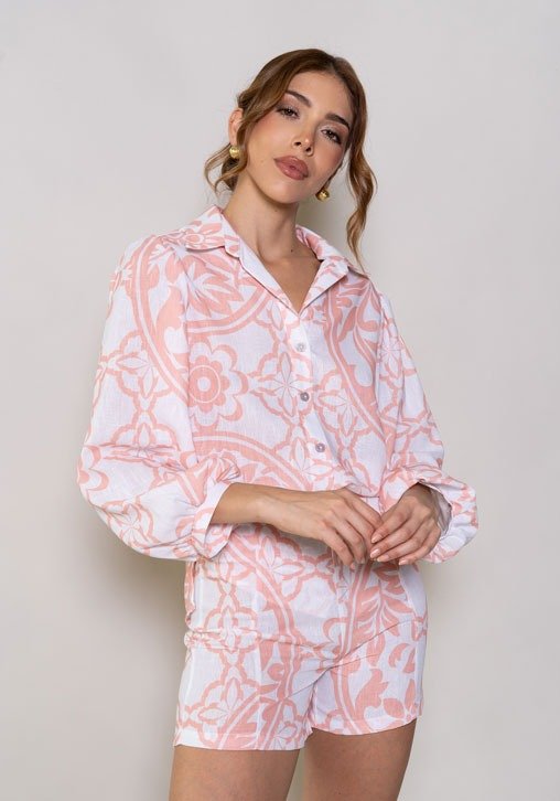 Set elaborado en lino, camisa con botonera y mangas amplias, short de tiro alto con bolsillos laterales.