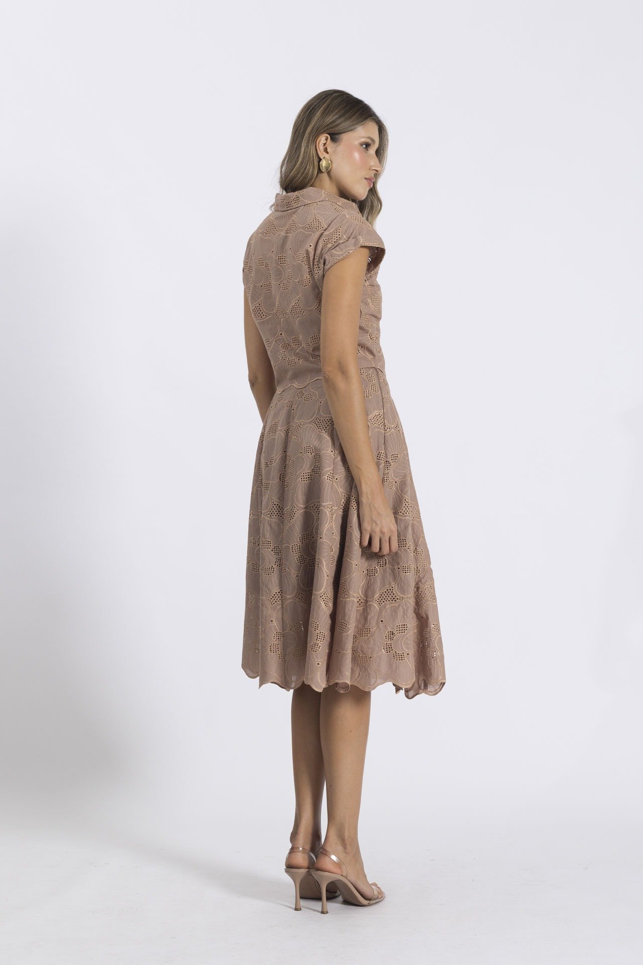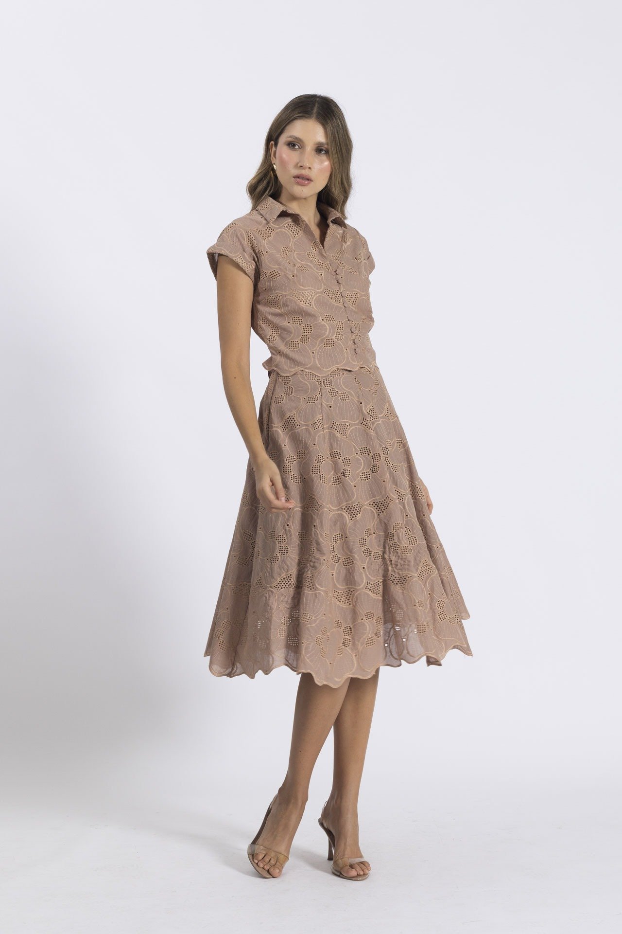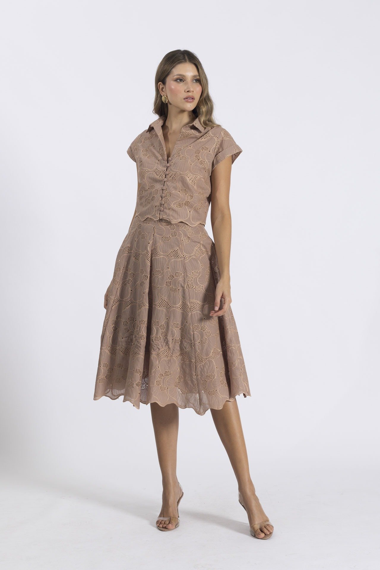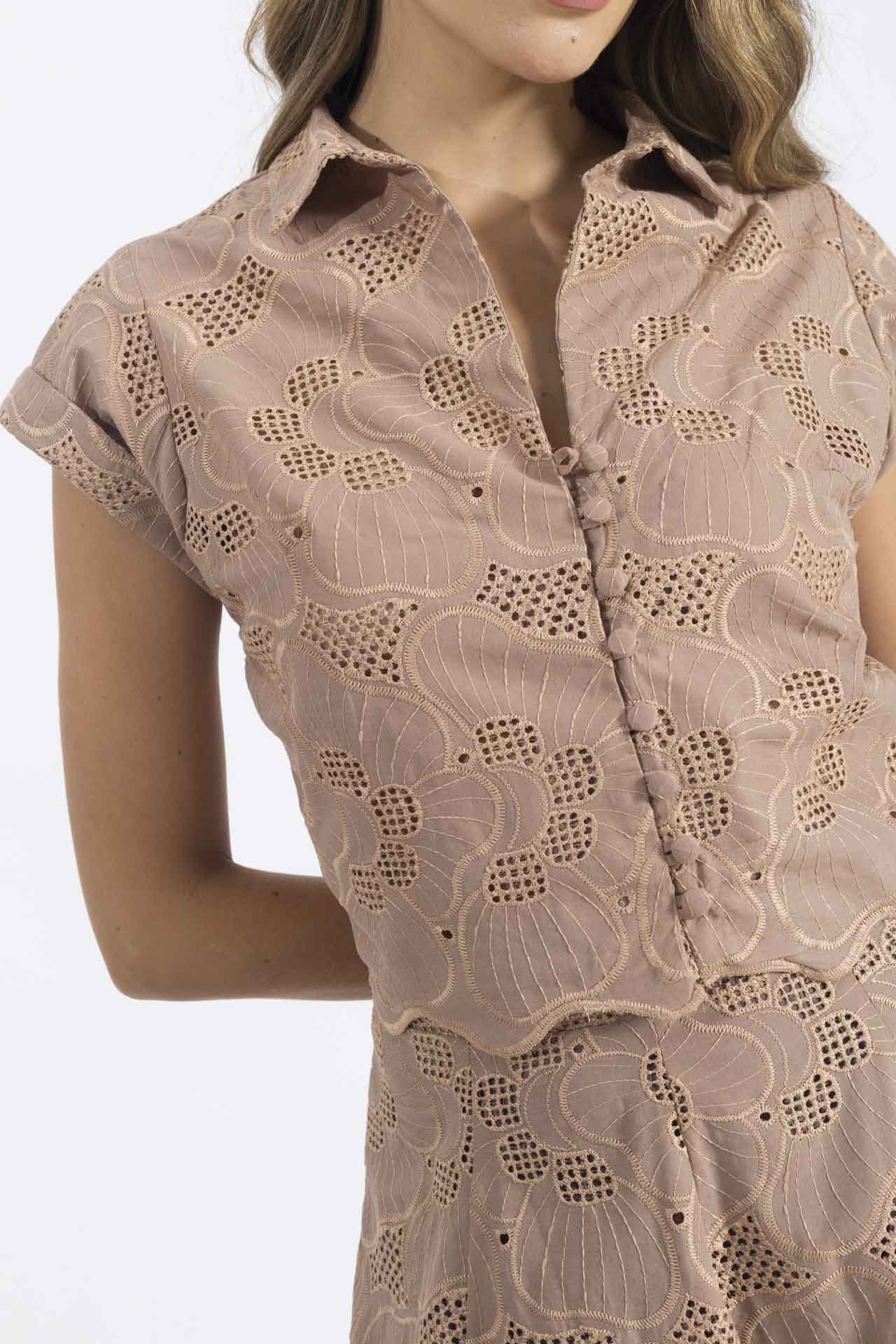 Este encantador set, elaborado en delicado ojalillo, combina la frescura del diseño con una silueta clásica y femenina. La blusa presenta botones forrados y cuello camisero, detalles que evocan un aire sofisticado.