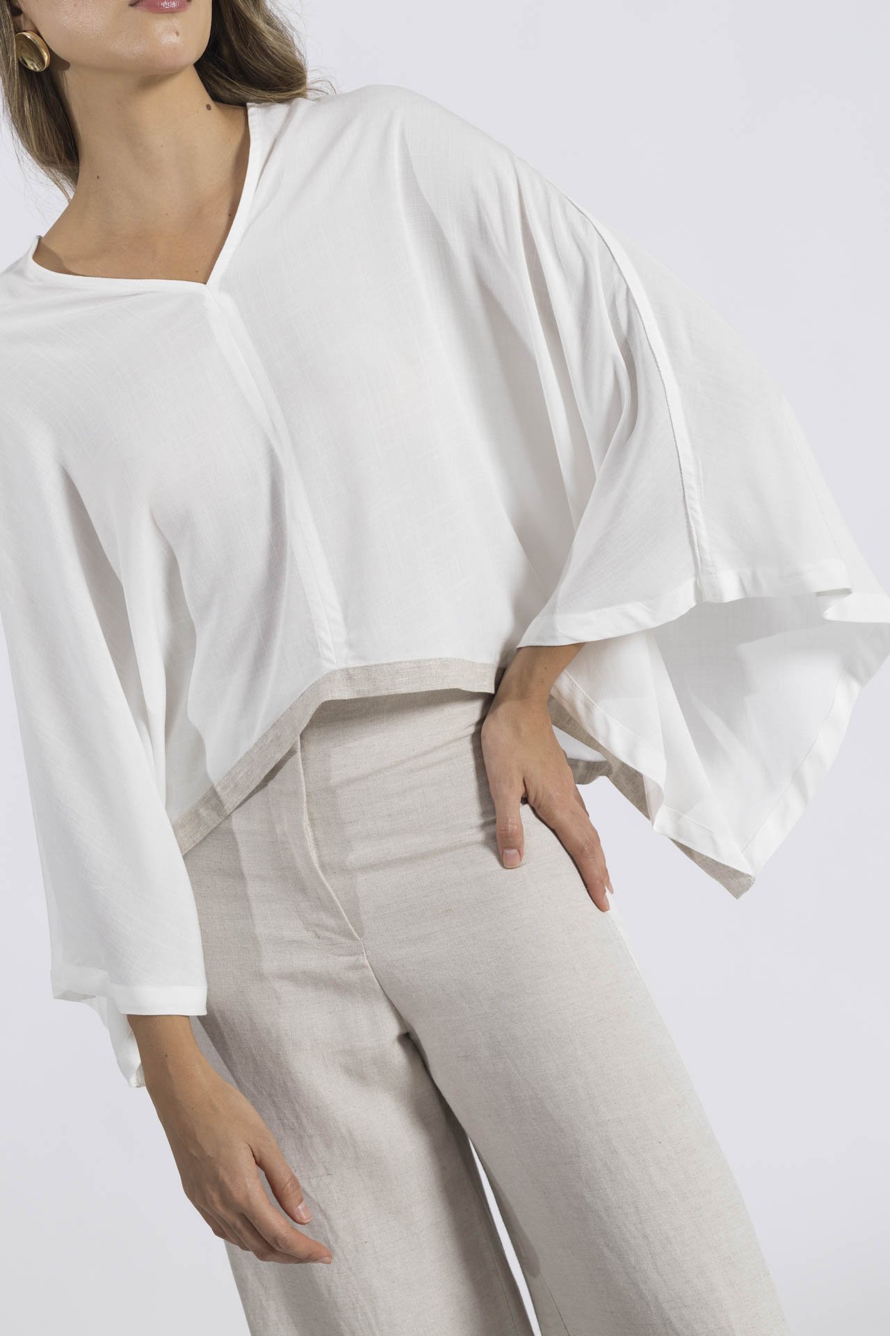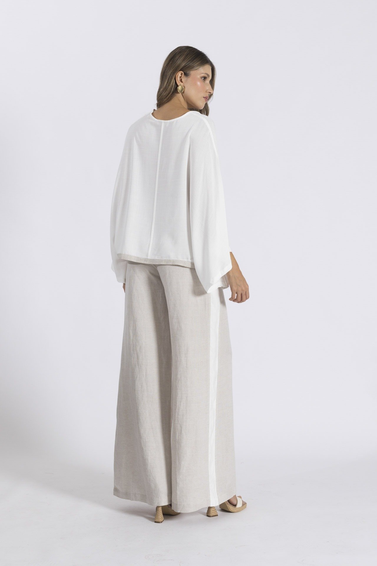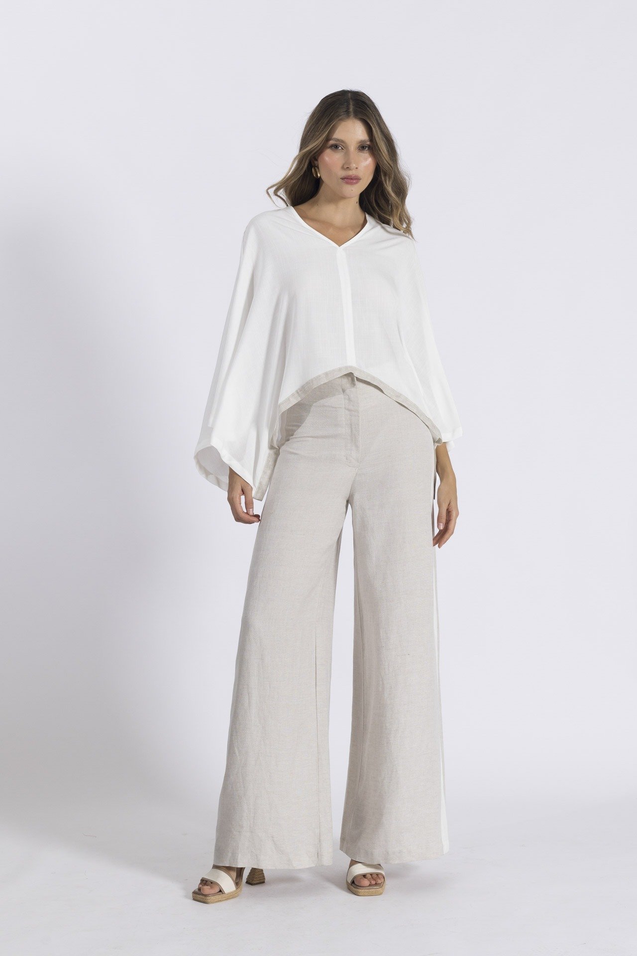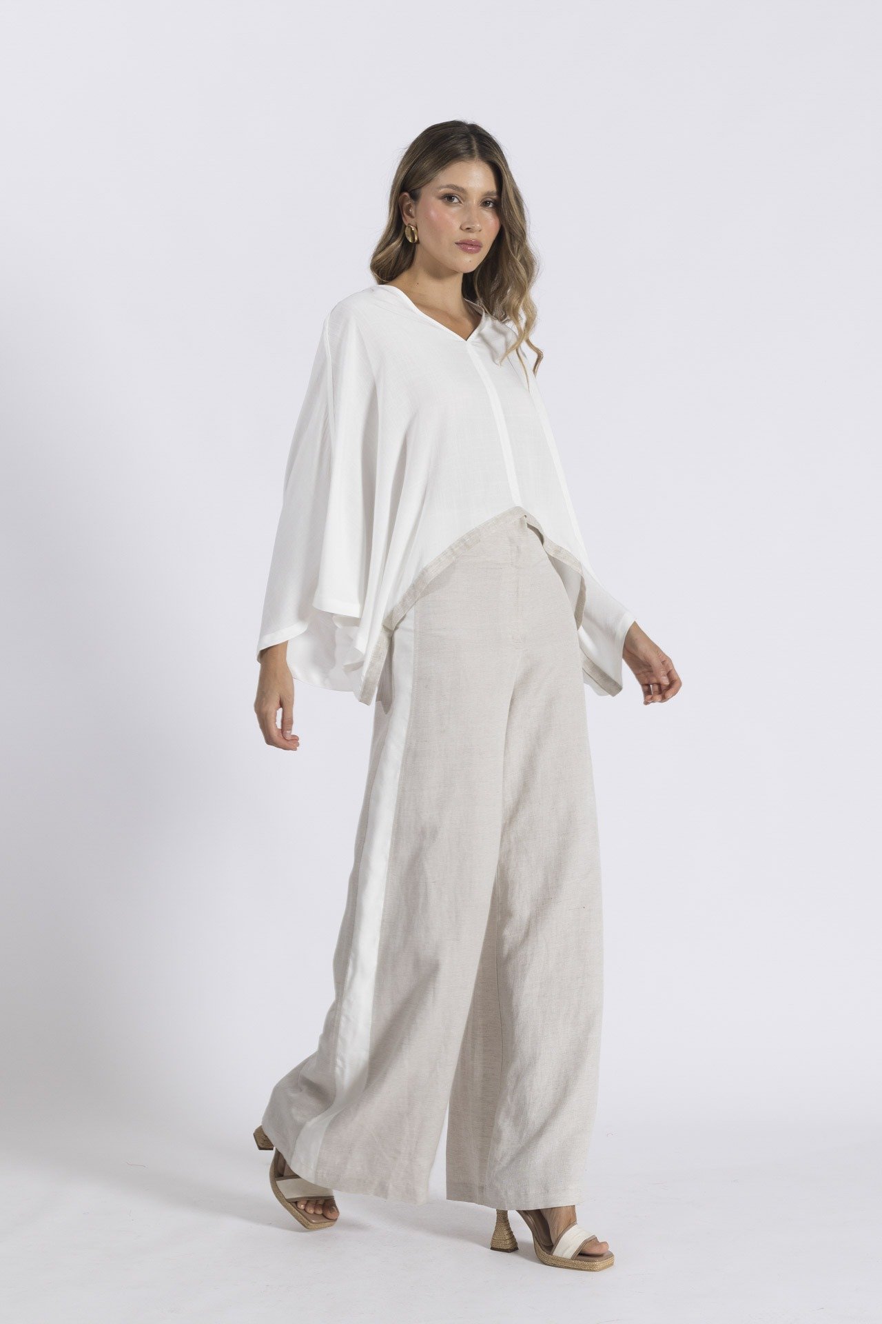 El set Violeta marfil está compuesto por una blusa de manga murciélago con delicados sesgos en los bordes, que añaden un toque distintivo y elegante. Estos detalles se conectan armoniosamente con el pantalón de bota amplia, realzado por una franja lateral en tono marfil que aporta contraste y modernidad. Ideal para combinar con otras prendas y crear looks variados para cualquier ocasión.
