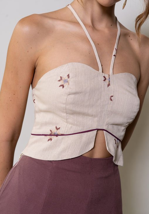 Este top, elaborado en lino bordado, presenta un diseño cautivador y moderno. Con un aplique de sesgo en el corte, resalta la delicadeza de la prenda, mientras que la espalda, bellamente adornada con dos aros de madera, agrega un toque único. La estructura de la prenda abraza la silueta femenina, realzando las curvas de manera sutil y destacando lo mejor de cada figura. Su diseño no solo añade sensualidad, sino también un aire contemporáneo, logrando un equilibrio perfecto entre comodidad y glamour. Ideal para quienes buscan una prenda que combine estilo y frescura en cada detalle.