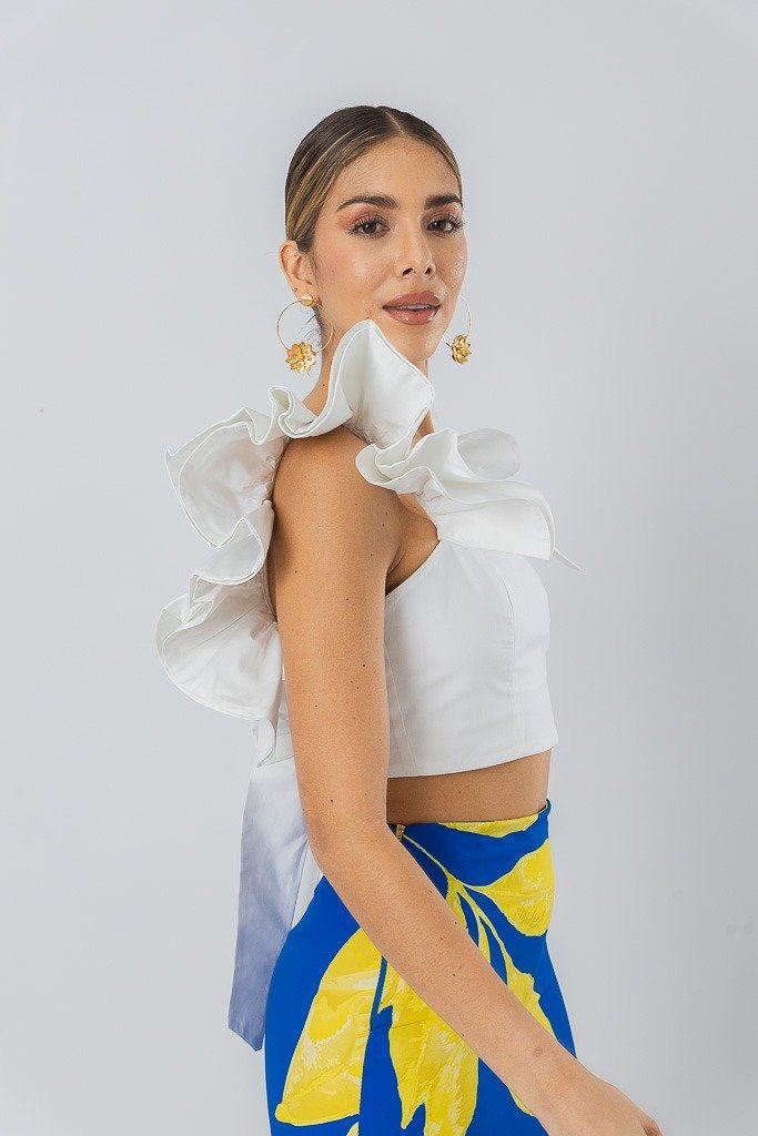 Nuestro top Kai para mujer es una prenda que destaca por su estilo único y femenino. Las golas en las mangas son el toque distintivo, agregando un aire romántico y encantador a tu look.
