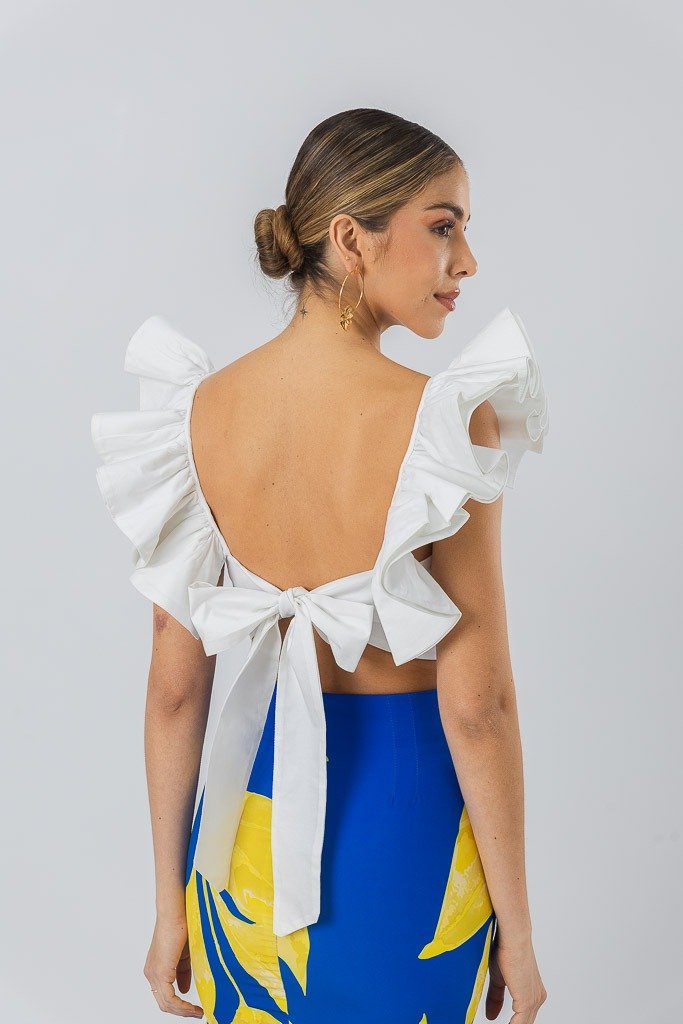 El detalle adicional de anudar en la espalda hace que sea realmente especial. El sistema de amarre te permite ajustar el top a tu medida, asegurando que se adapte perfectamente a todo tipo de cuerpo. Además, el resultado final de este sistema es un hermoso moño en la espalda, agregando un toque de dulzura y sofisticación al diseño.