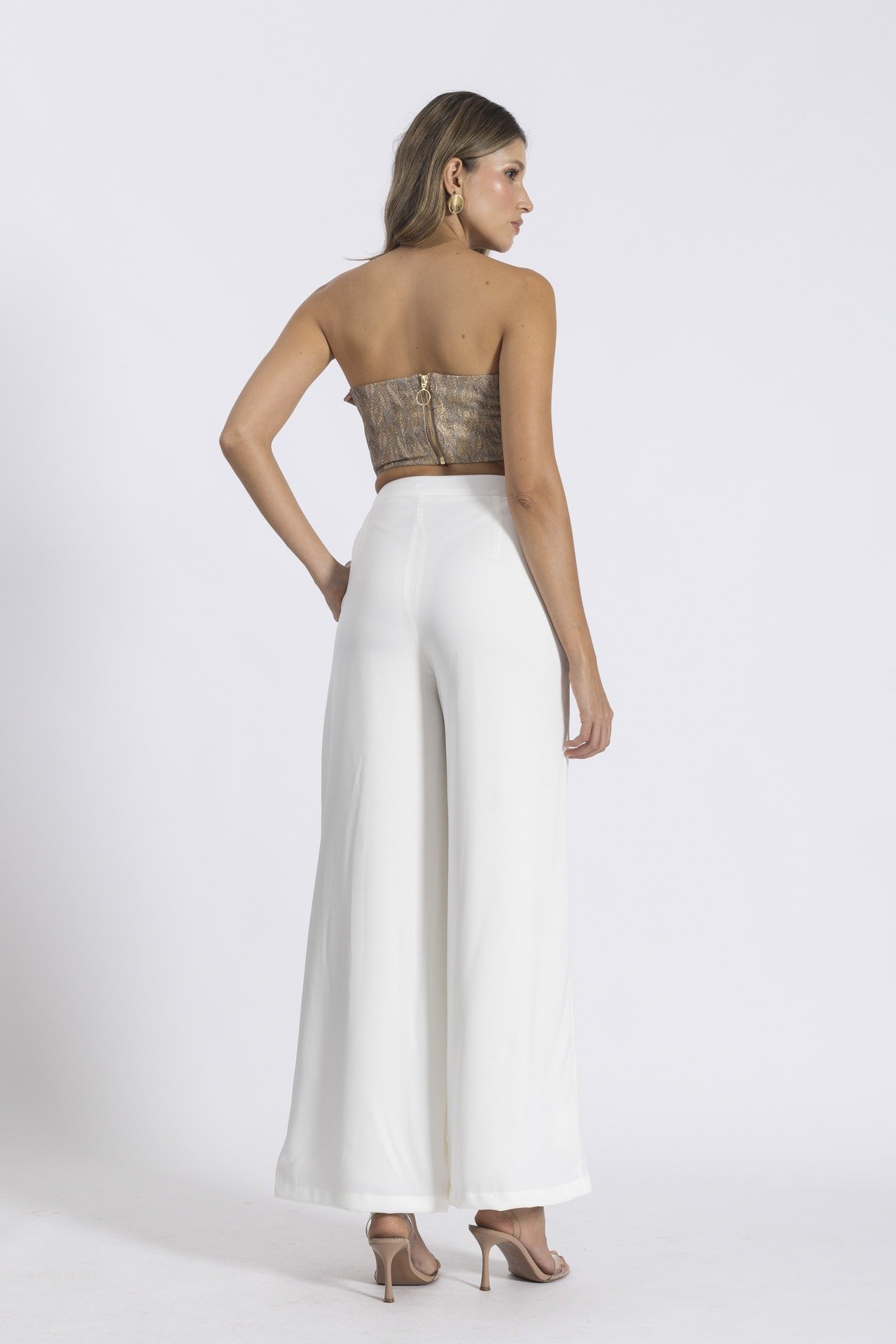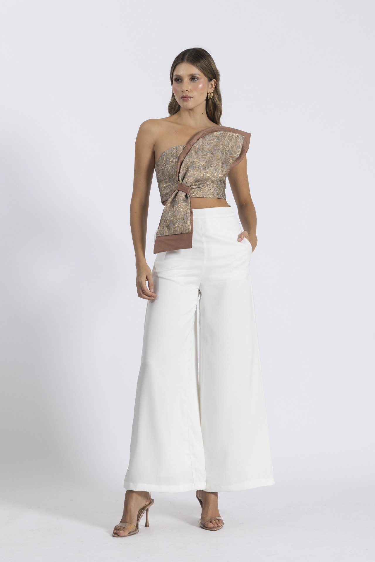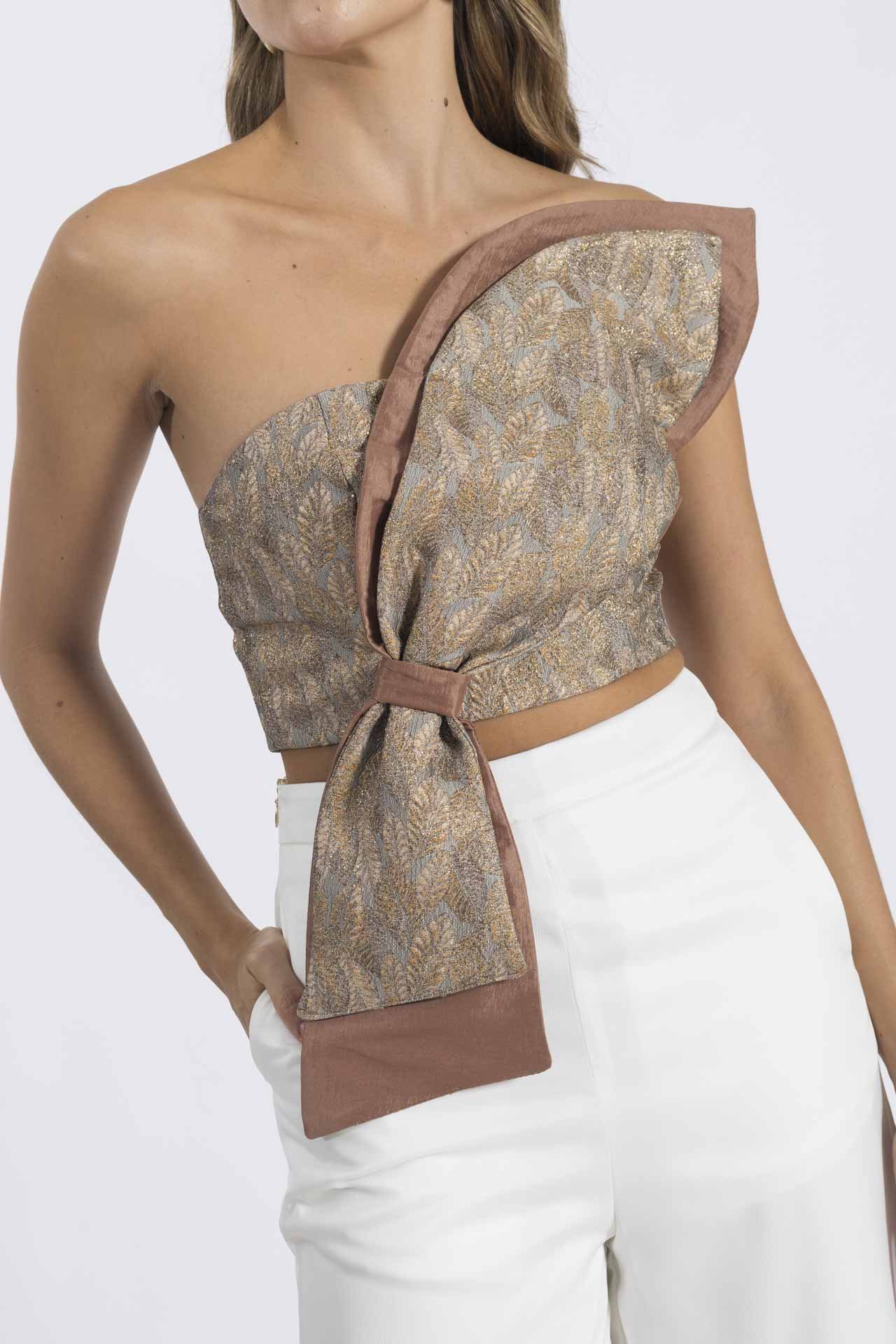 El Top Tessa refleja exclusividad y elegancia moderna. Diseñado con un escote strapless y elaborado en una combinación de telas: un jacquard con destellos brillantes y mezcla de colores, y un tafetán satinado unicolor que equilibra el diseño. Su detalle en forma de pétalo realza la silueta y lo convierte en una pieza ideal para cenas navideñas, eventos formales o encuentros laborales con estilo.