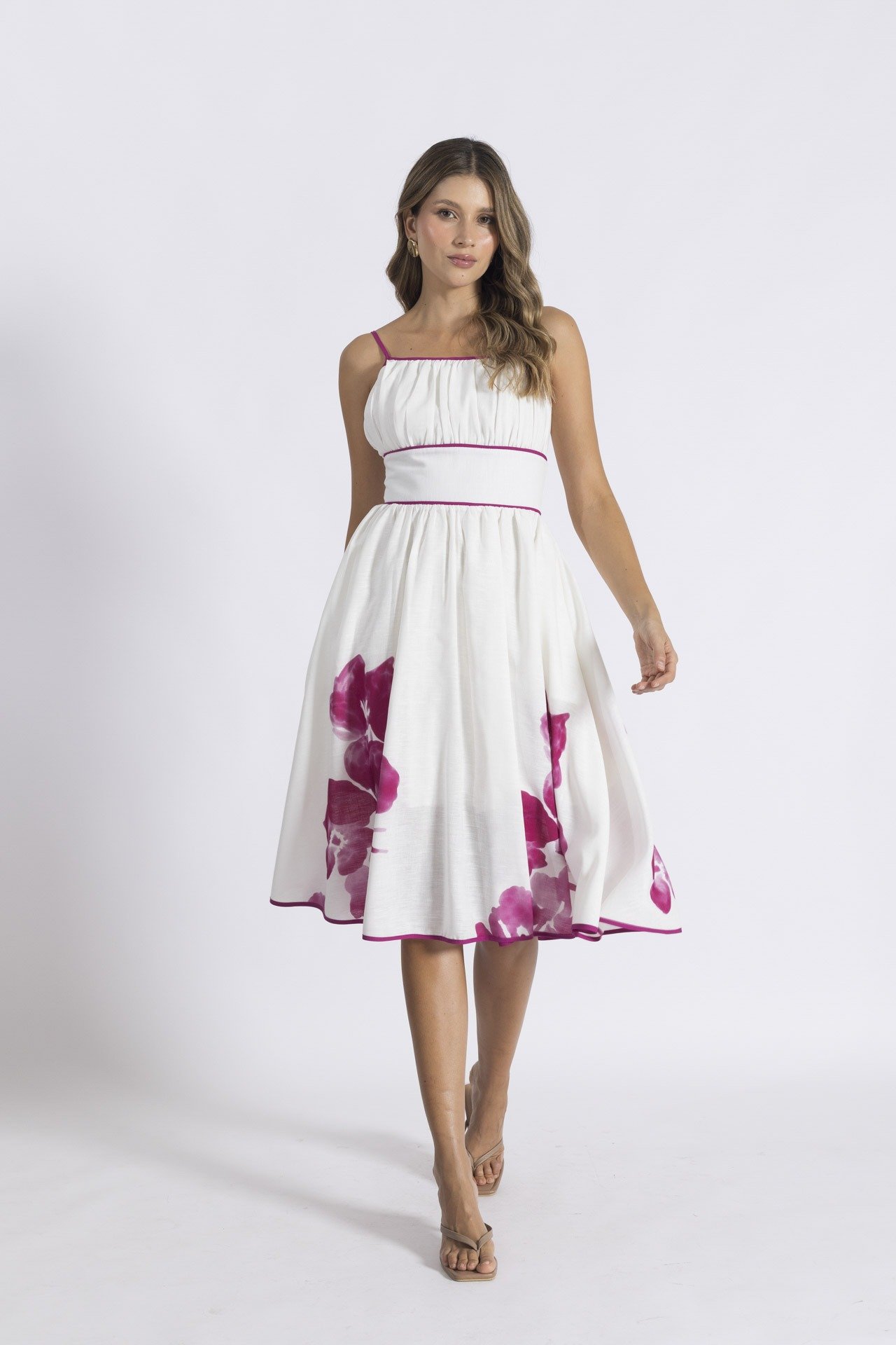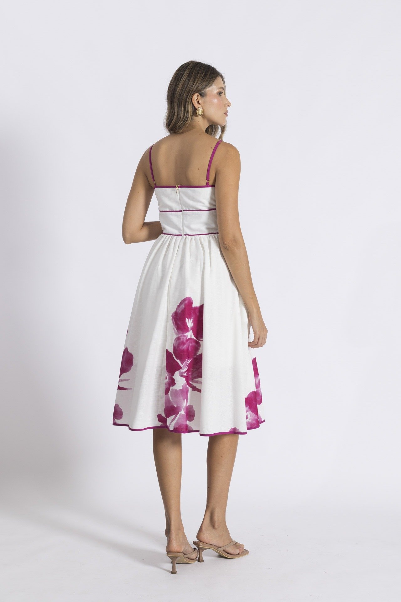 Este encantador vestido midi, elaborado un suave en lino sintético, es la opción perfecta para un look fresco y delicado. Con un escote y cintura decorados con un sutil sesgo embonado, resalta la figura de manera sofisticada. Los tirantes ajustables permiten un ajuste personalizado para mayor comodidad. Su textura ligera y fresca lo convierte en una prenda ideal para climas cálidos, brindando una sensación de ligereza y suavidad. Su diseño casual lo hace perfecto para un brunch entre amigas, combinando estilo y confort con un toque de feminidad.