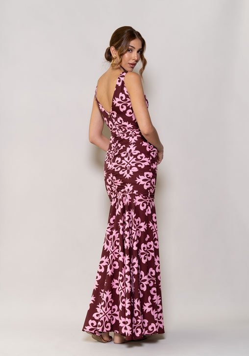 Vestido elaborado en seda mate sin brillo, escote central forrado en mayatex, silueta ajustada con fruncidos laterales, escote en V en espalda con cremallera central.