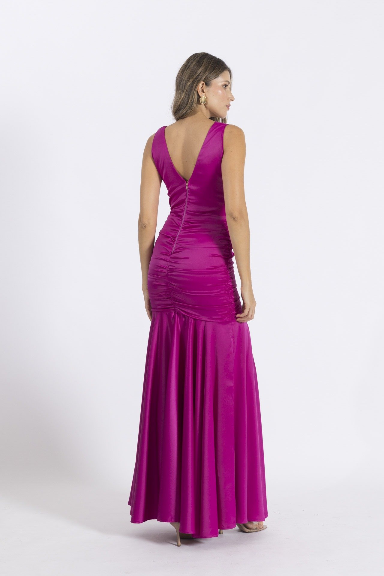 Vestido elaborado en seda omegan con ligero brillo, escote central forrado en mayatex, silueta ajustada con fruncidos laterales escote en V en espalda con cremallera central.