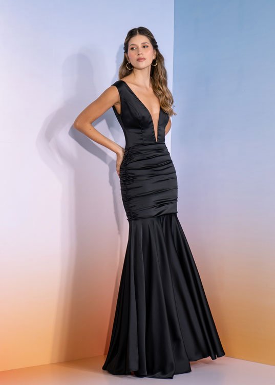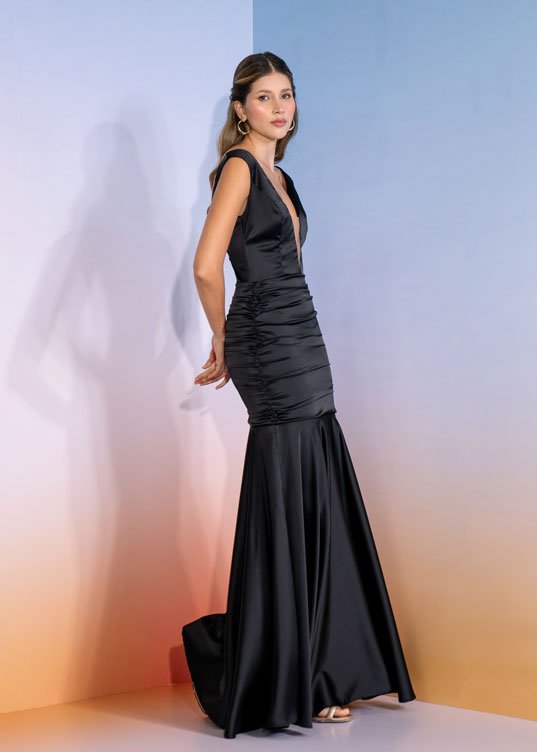 Vestido elaborado en seda omegan, corte ceñido al cuerpo, escote con maya, falda recogida en laterales que dan el efecto de fruncido, espalda con escote en V con cremallera en el centro.