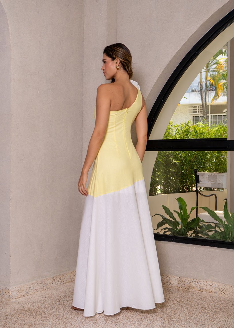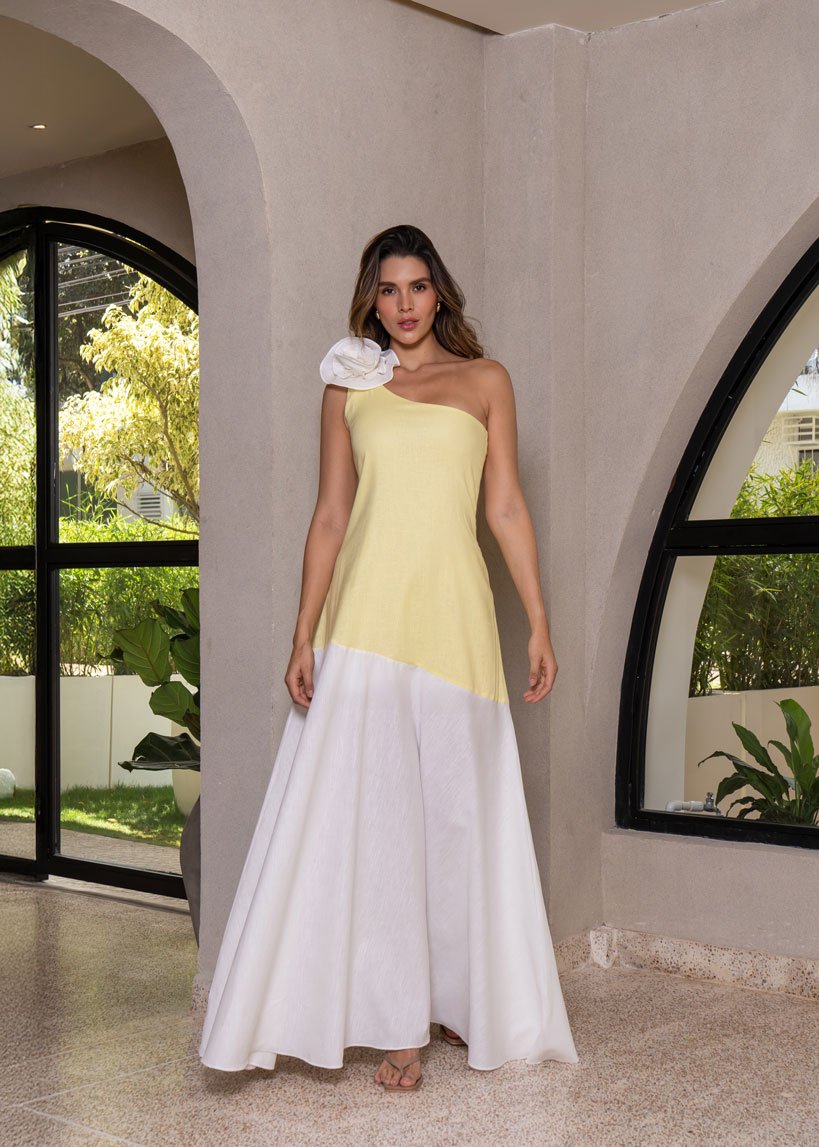 Romántico y fresco, el vestido Alma en color amarillo destaca por su escote medio beso adornado con un delicado detalle de rosa. Su silueta amplia y ligera lo convierte en la elección perfecta para un date de fin de semana, un paseo por la playa o el día a día. El contraste de colores en el diseño le da un toque único y cautivador que no pasa desapercibido.