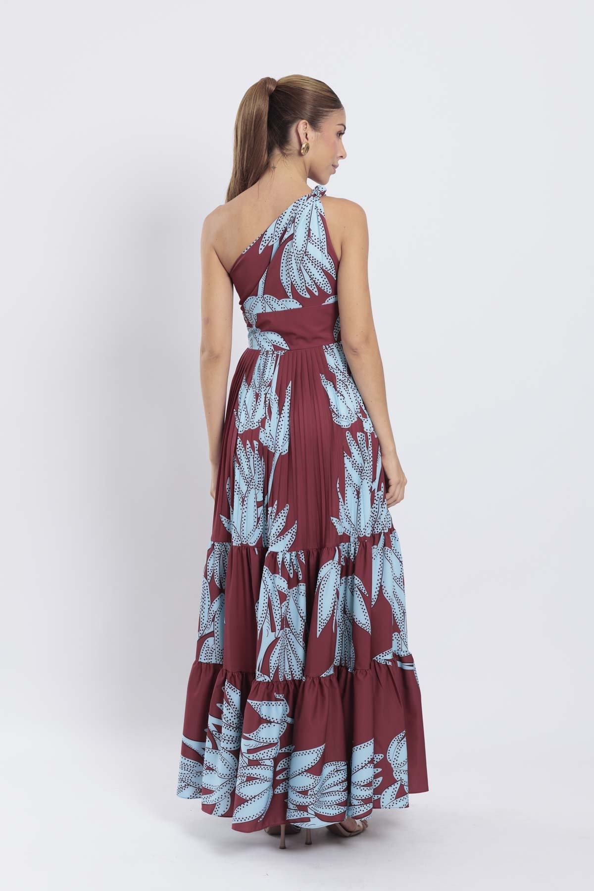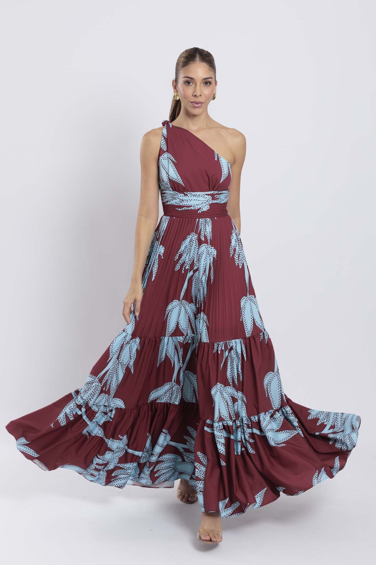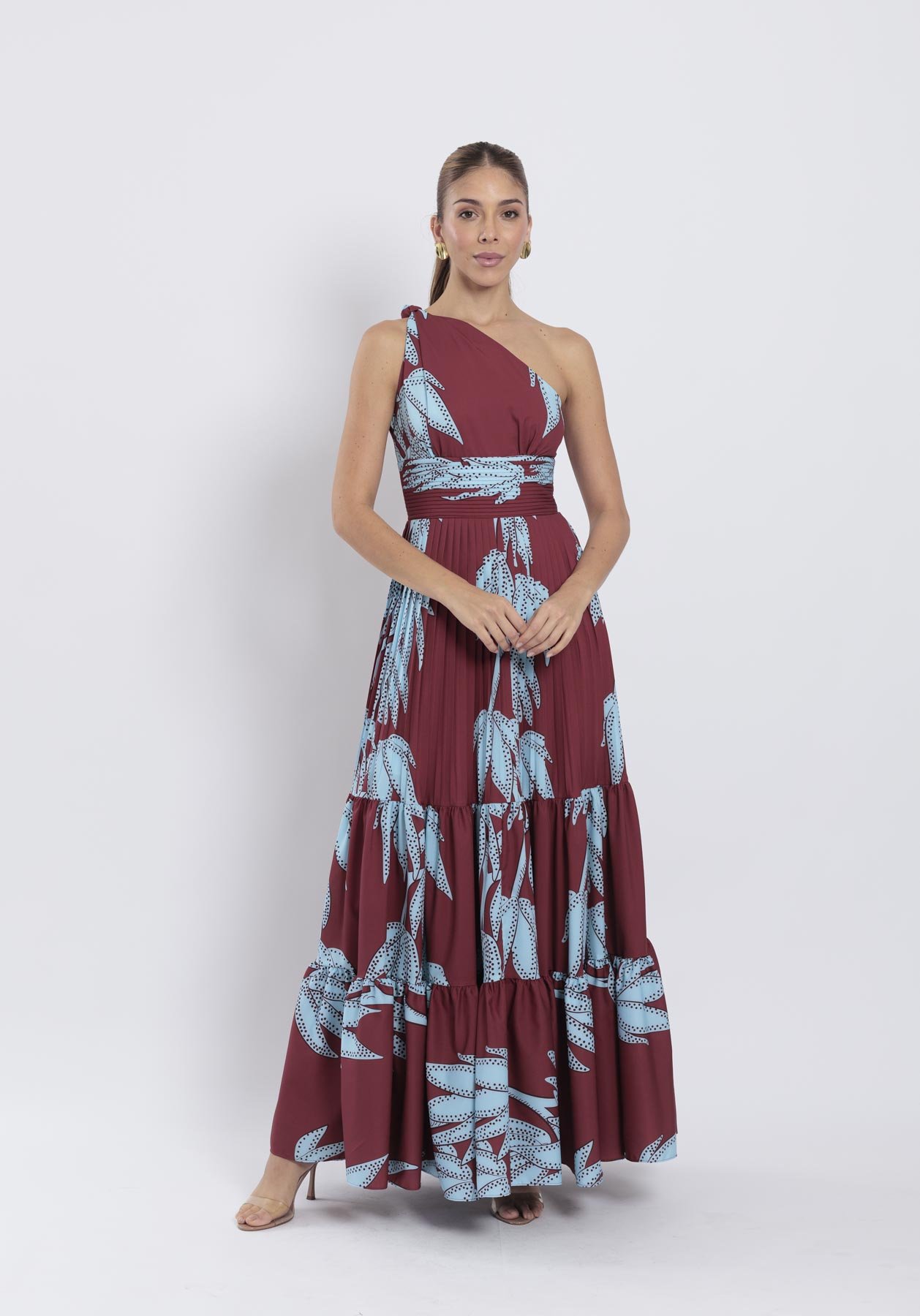 Nuestro vestido Aly largo en color vino tiene un escote one shoulder adornado de un nudo en el hombro y una pretina plisada que acentúa de manera encantadora la cintura y la falda plisada en su primer nivel y el bloque de golas fruncidas proporciona amplitud y movimiento al conjunto.