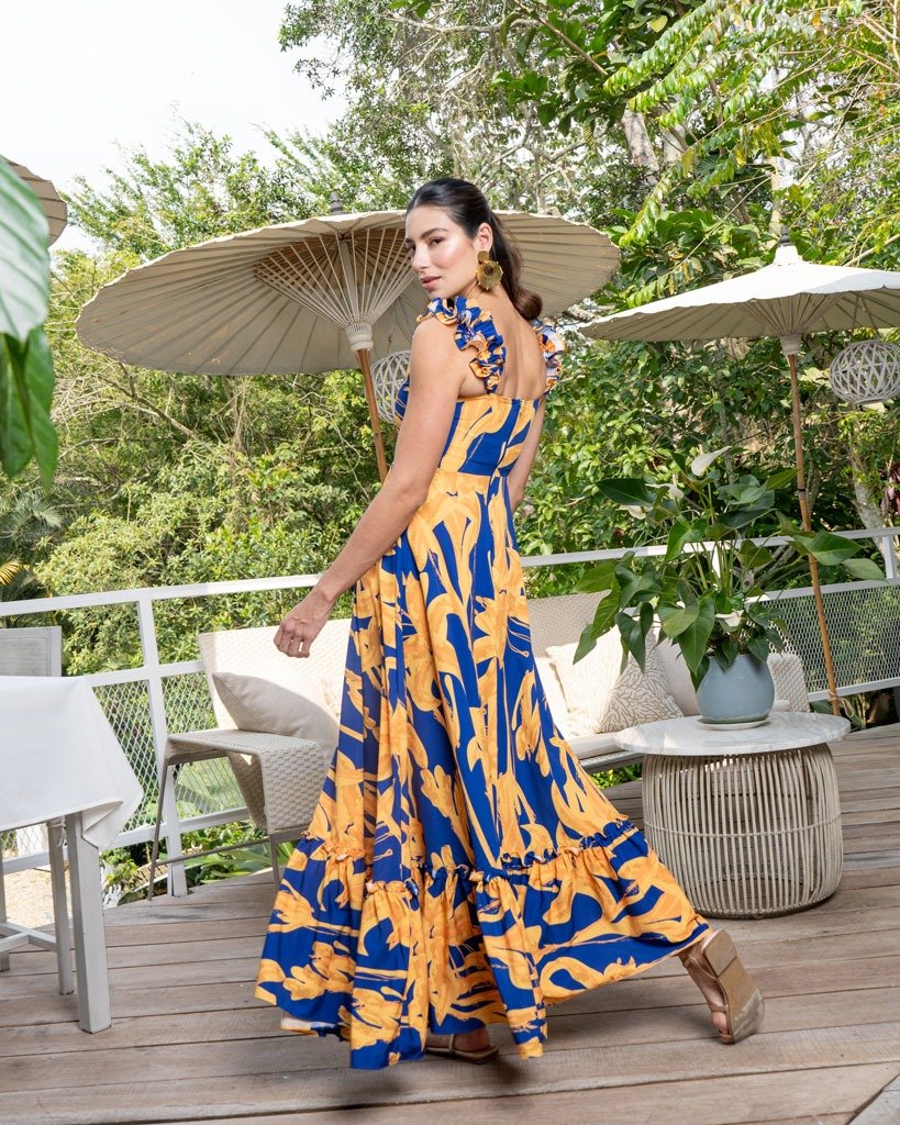 Vestido elaborado en seda estudio F, escote corazón, mangas con tirante plisado, detalle delantero con cintura decorada con alforzas, falda amplia.
