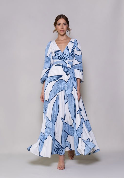 Vestido manga larga plisado elaborado en seda estudio, escote cruzado, falda semirotonda y cremallera en el centro de la espalda.