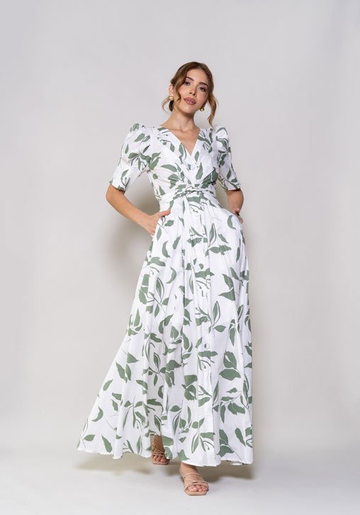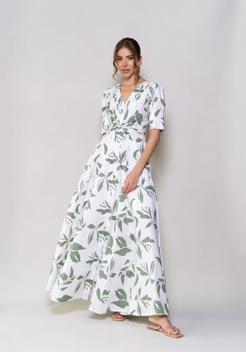 Este vestido es una pieza única que fusiona la elegancia casual con un toque bohemio chic. Su cierre de botonera en el frente le da un toque clásico y funcional, mientras que el detalle de anudar al frente o atrás permite personalizar el ajuste y aportar un toque único. Confeccionado en popelina sublimada, su tela liviana y suave te envolverá en comodidad mientras luce moderna. Un escote en V delicado resalta tu figura, este vestido emana una energía relajada y a la vez sofisticada, perfecto para quienes buscan un look lleno de frescura y feminidad.