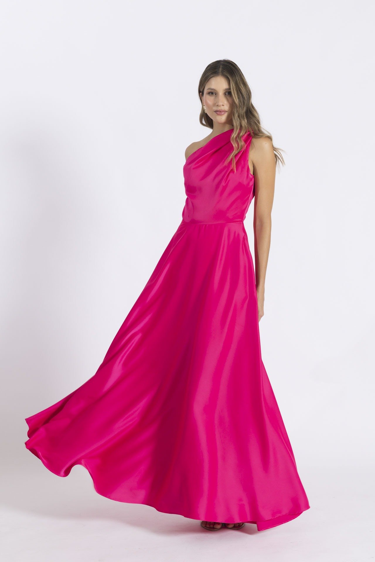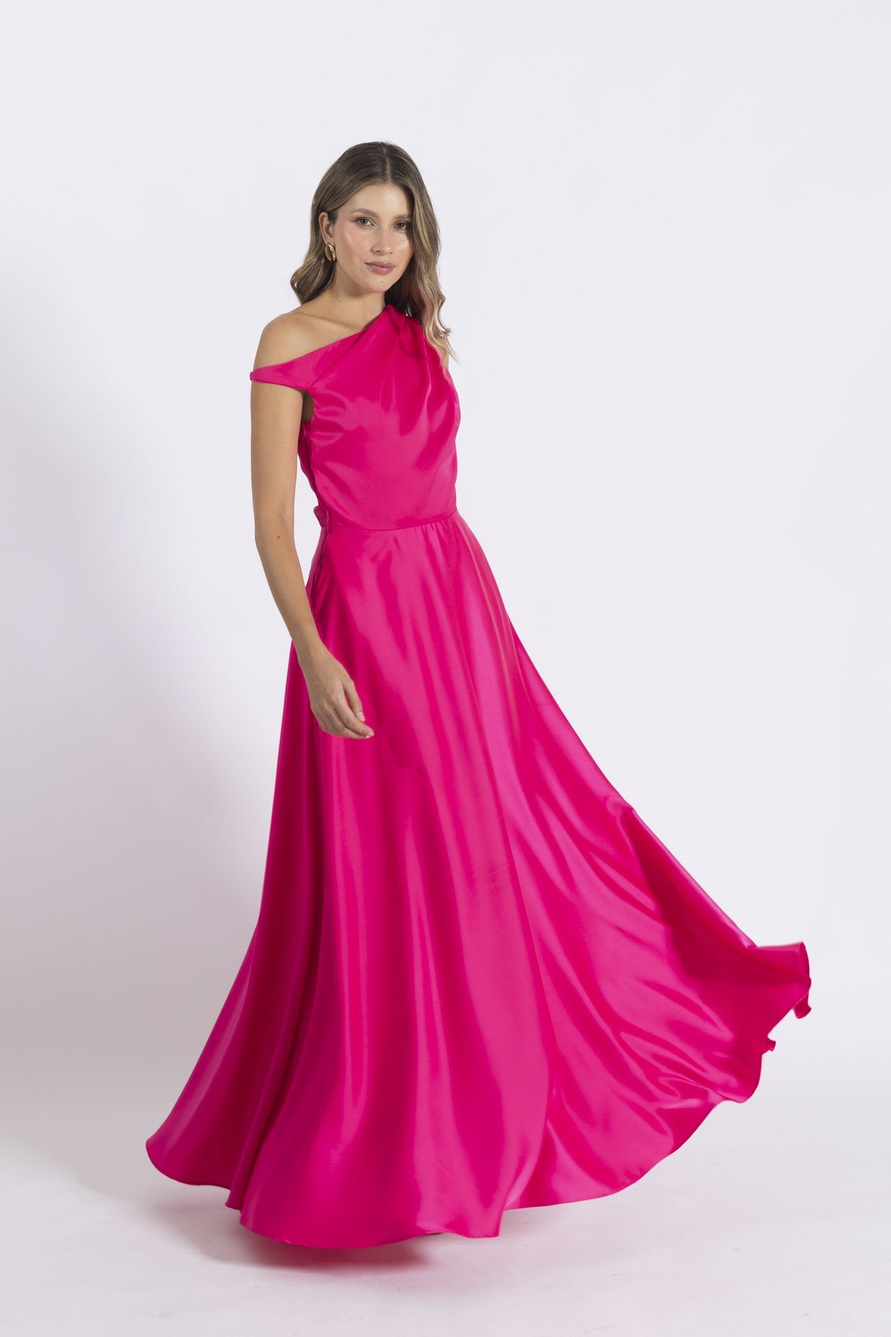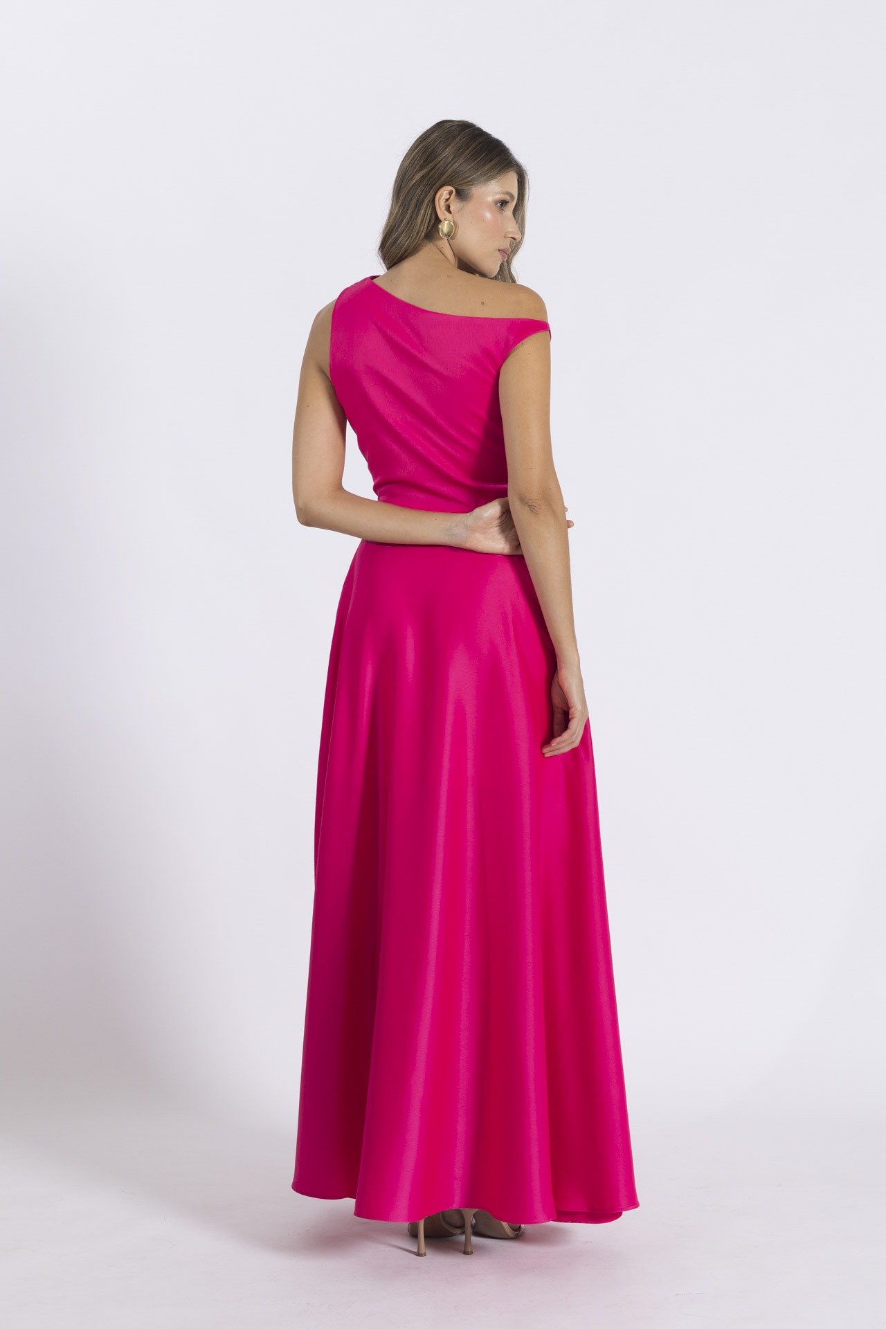 Vestido elaborado en seda satinada omegan, escote diagonal con pliegues en hombro con escote asimétrico, falda rotonda con cremallera en lateral.