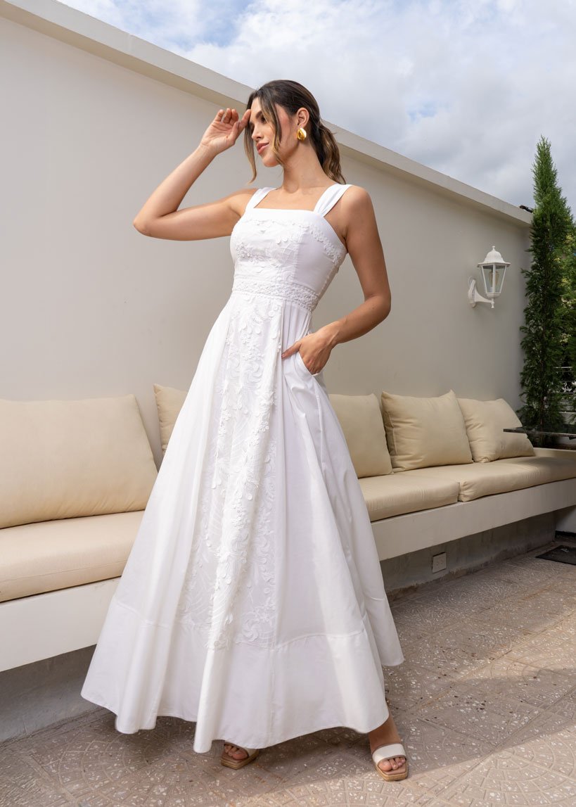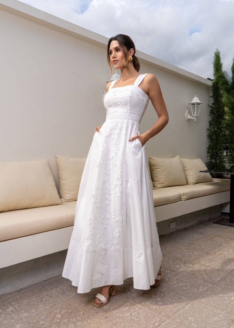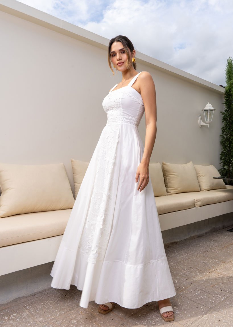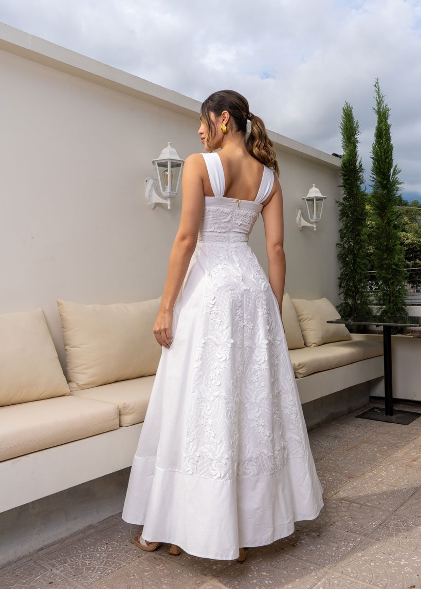 El vestido Azucena combina de forma armoniosa tela bordada, encaje y textil liso, creando un diseño lleno de contrastes sutiles y sofisticación. Cada detalle está pensado para resaltar con elegancia en ocasiones especiales. Ideal para una ceremonia civil, un baby shower o primeras comuniones, donde lo delicado y lo memorable se encuentran.