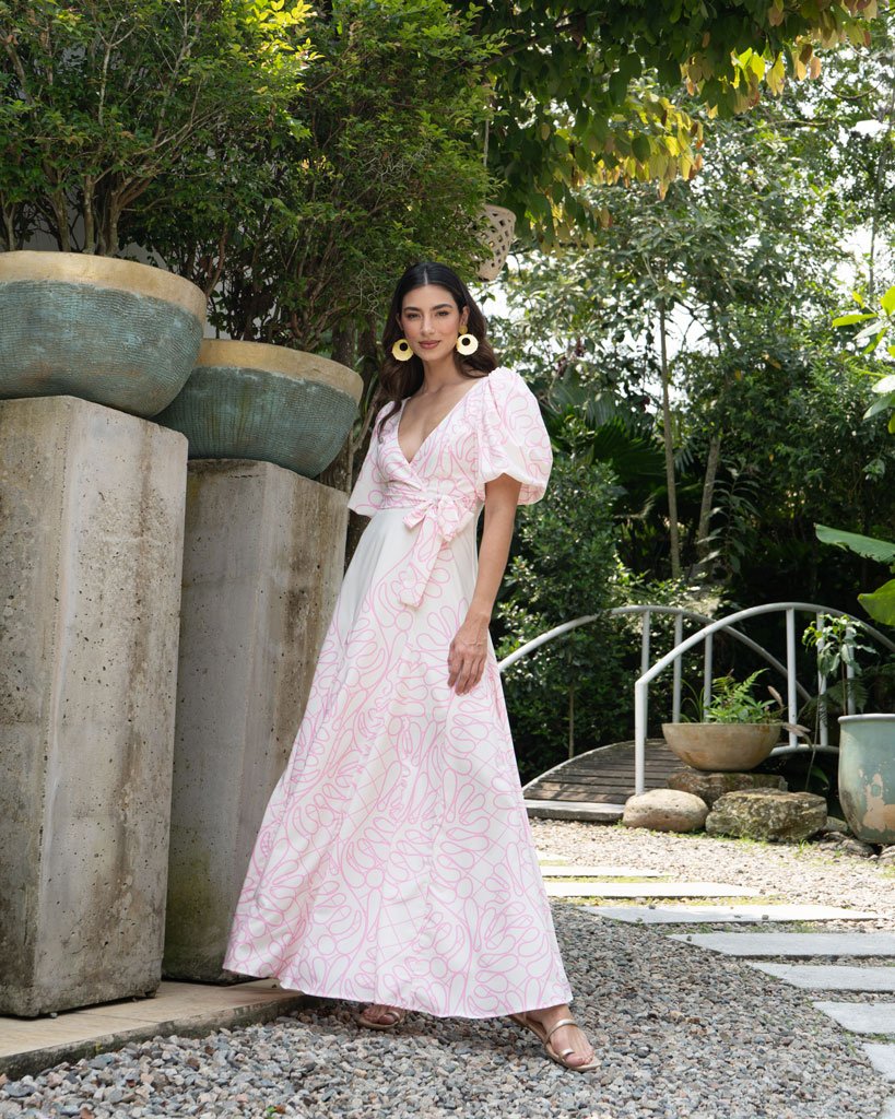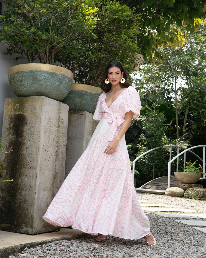 Elaborado en seda estudio F, escote cruzado, manga puffy falda amplia con corte en nesgas y cremallera en espaldar.