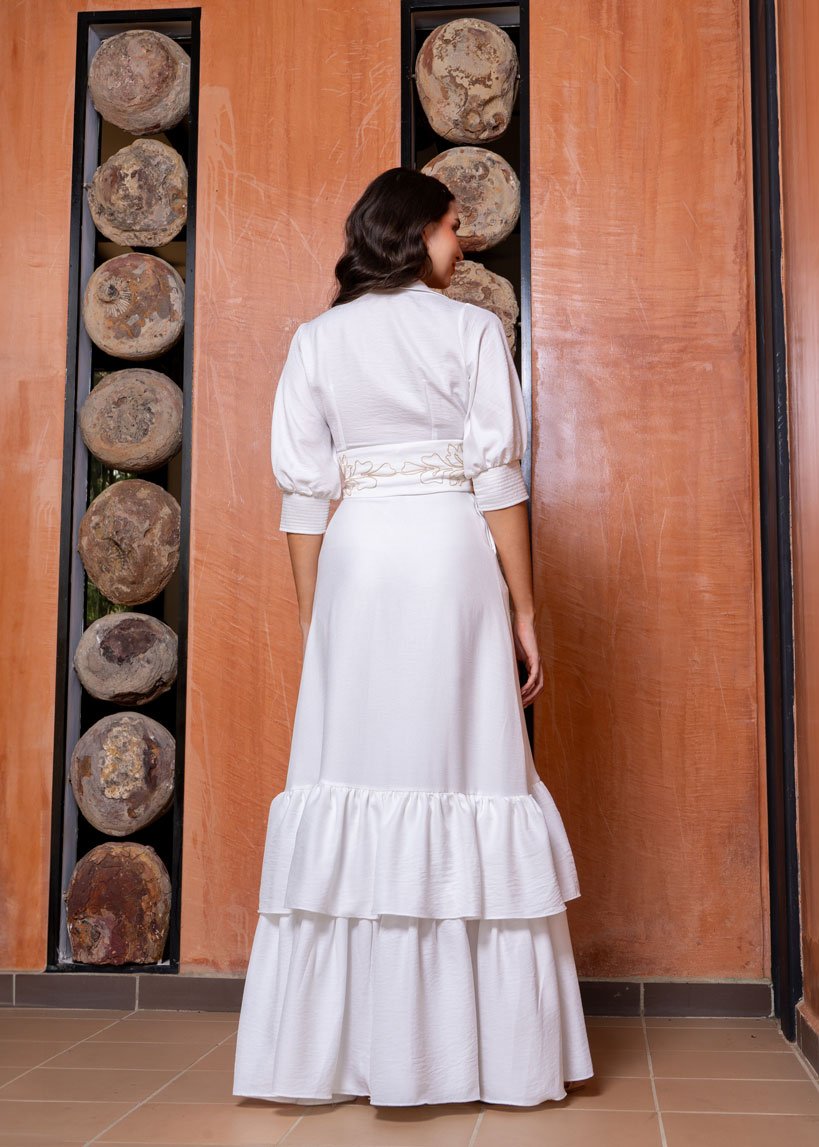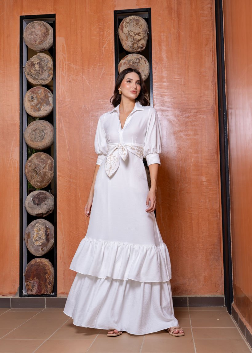 El Maxi Vestido Beatriz destaca por su escote en V con cuello camisero y sus elegantes mangas abullonadas con costuras en tono contrastante en los puños. Su falda lisa con golas fruncidas aporta fluidez y movimiento, mientras que el cinturón removible con bordado añade un detalle único y sofisticado. Perfecto para una boda, un evento importante o cualquier ocasión en la que quieras resaltar con elegancia y estilo.