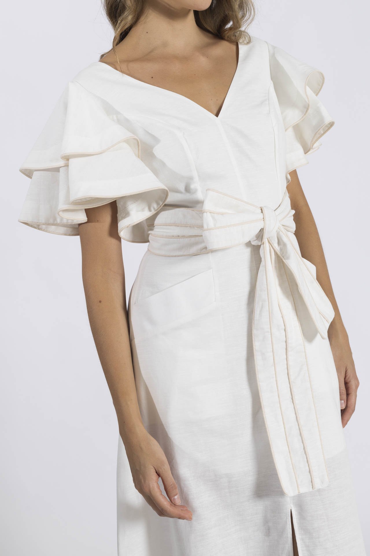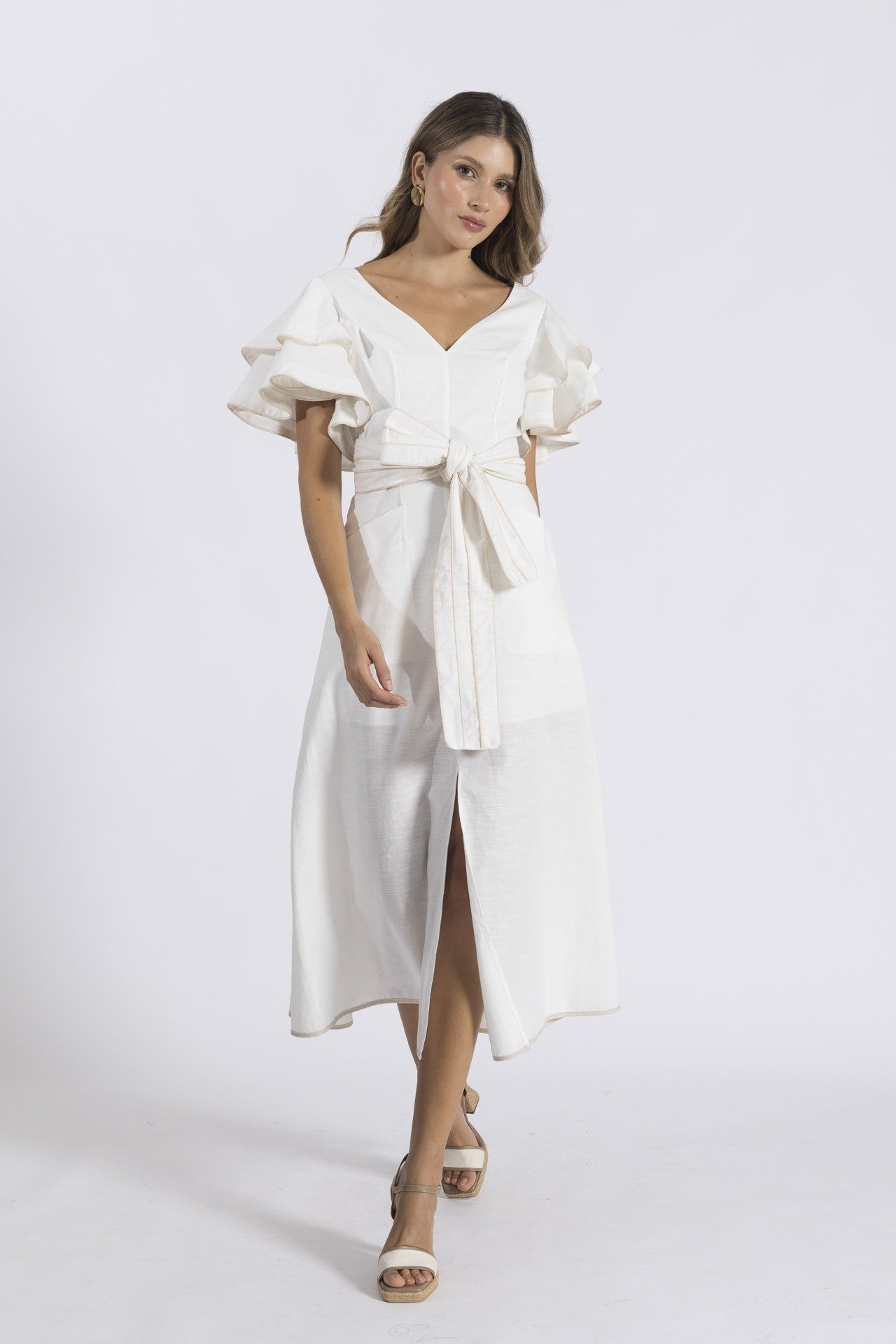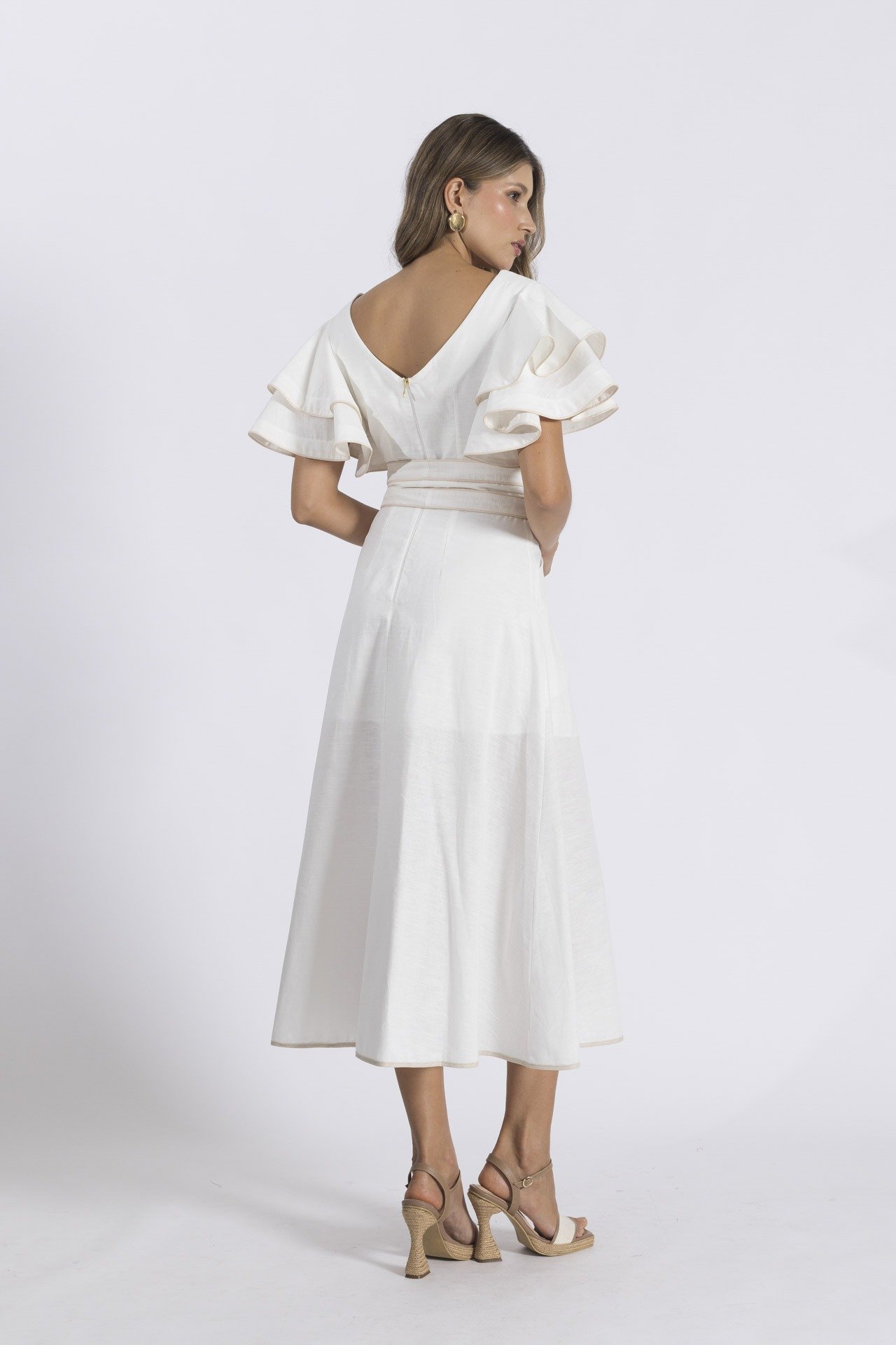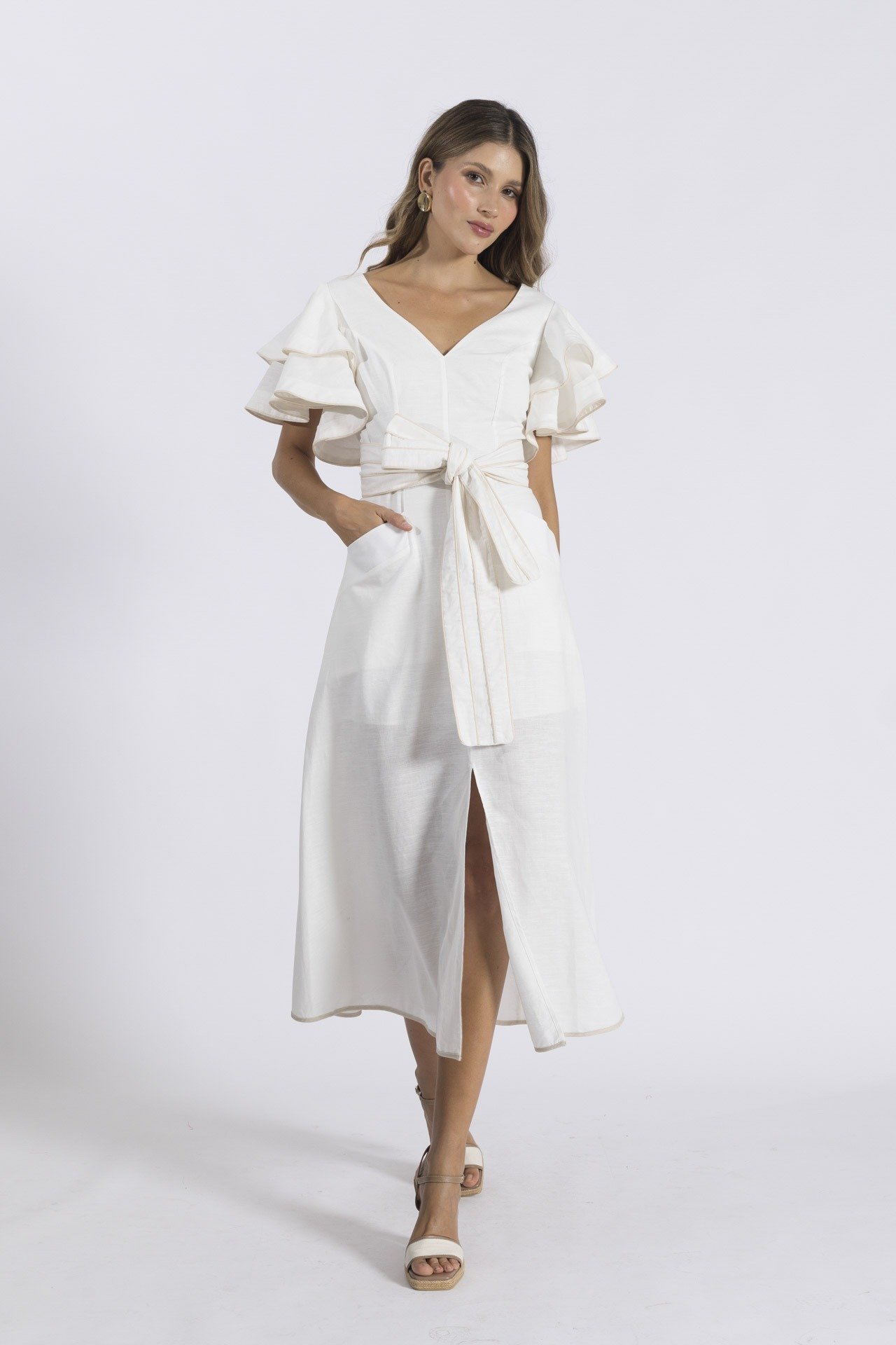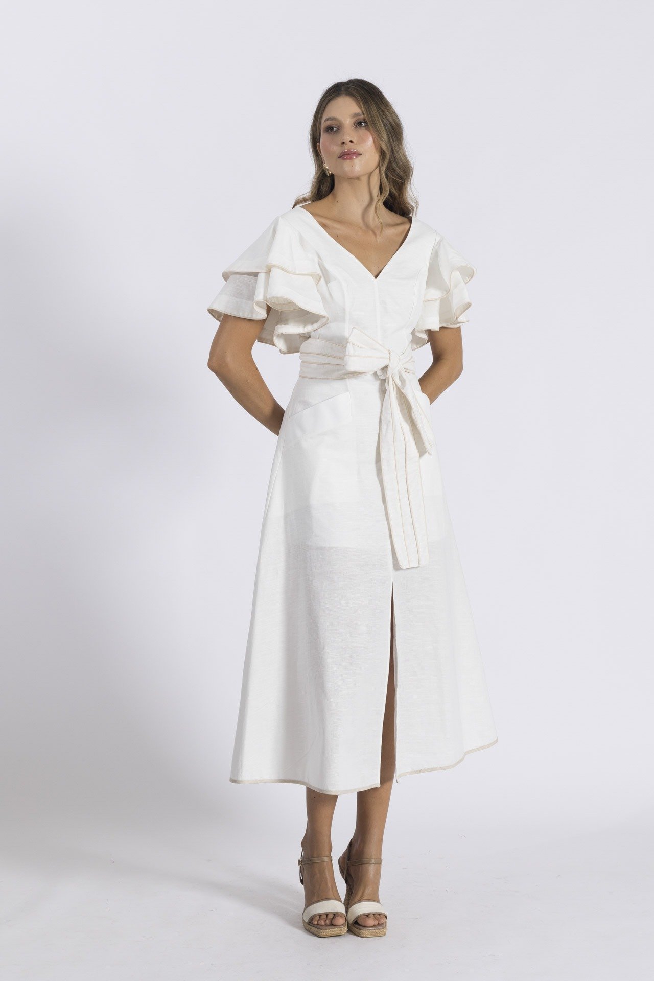 El vestido Bianca marfil destaca por su escote en V, mangas con volantes y delicados sesgos que realzan su diseño. Su silueta midi con abertura central aporta movimiento, mientras que el cinturón removible define la cintura con elegancia. ¿Un plus? Los bolsillos, que suman funcionalidad y un toque auténtico. Ideal para una reunión de trabajo o un evento de día con mucho estilo