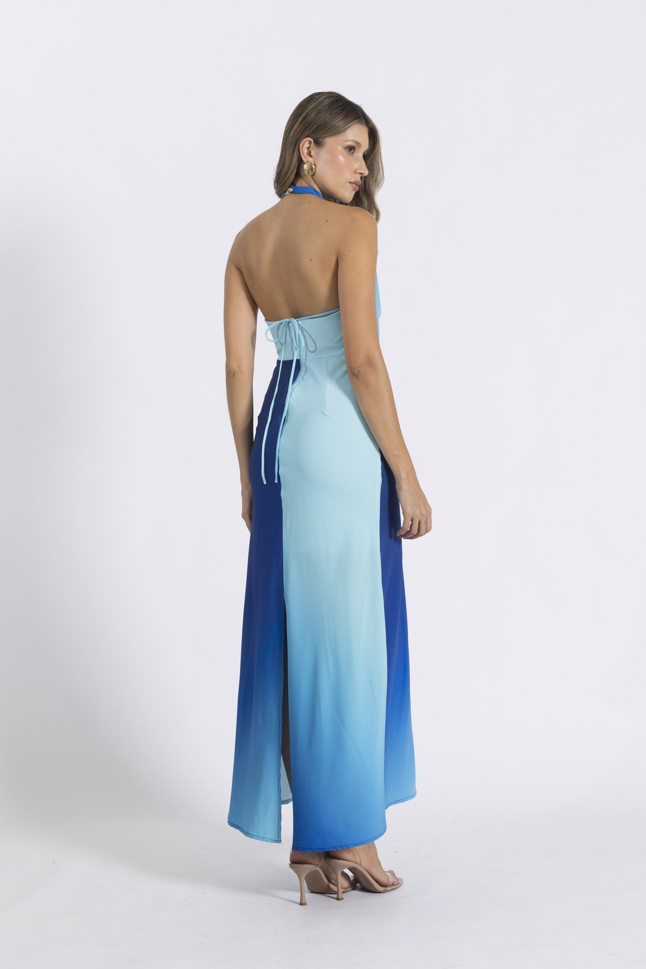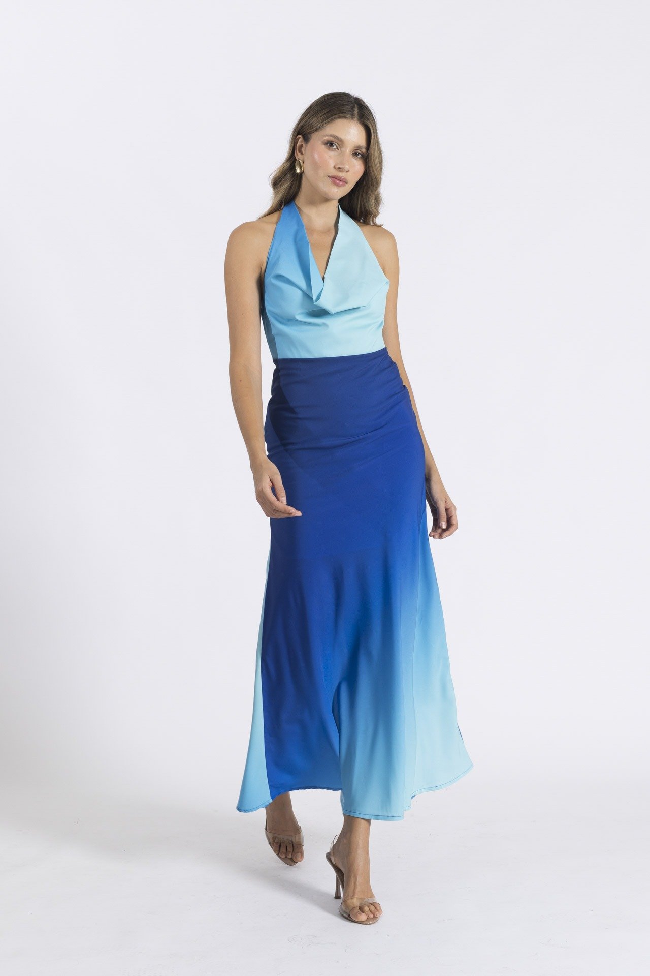 Vestido elaborado en seda estudio mate, escote halter, ligero drapeado y botón en cuello, cremallera en el centro de la espalda y abertura en falda en espalda.