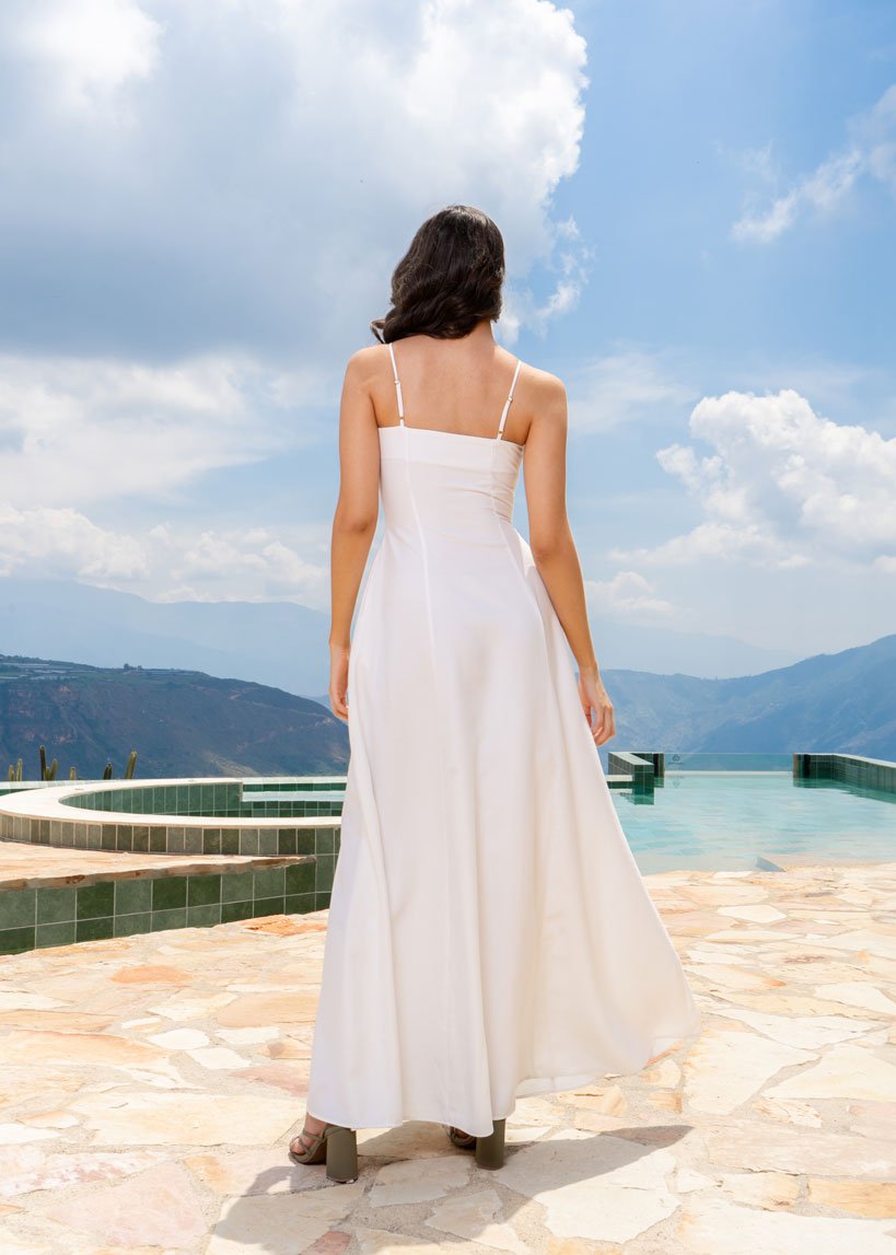 El Vestido Cairo es la musa de nuestra colección, una pieza que, en medio de su silueta minimalista, resalta por su encantador detalle de flor, elaborado manualmente con precisión artesanal. Este diseño es ideal para un matrimonio civil, un evento en la playa o cualquier ocasión especial donde quieras destacar con elegancia y sutileza.