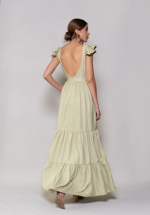 Vestido elaborado en rayón diagonal, falda en bloques, delantero anudado fijo, espalda escotada con cremallera en la falda.