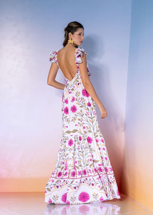 Vestido elaborado en seda estudio mate, forrado, falda en bloques fruncida, delantero cruzado anudado fijo, espalda escotada y cremallera en el centro de la espalda.