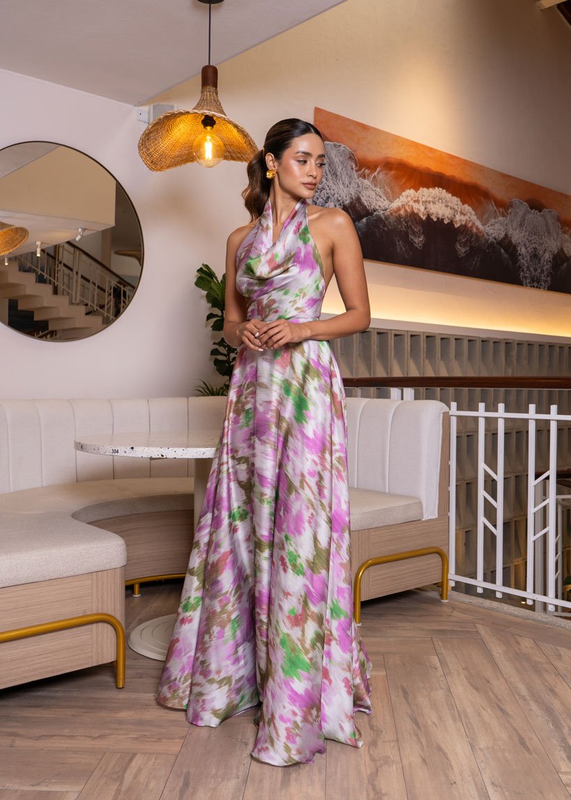 El vestido Clara enamora con su escote halter drapeado y una falda rotonda con volumen que aporta movimiento y ligereza. Su detalle más especial está en la espalda descubierta, adornada con tiras entrelazadas que terminan en elegantes punteras doradas.