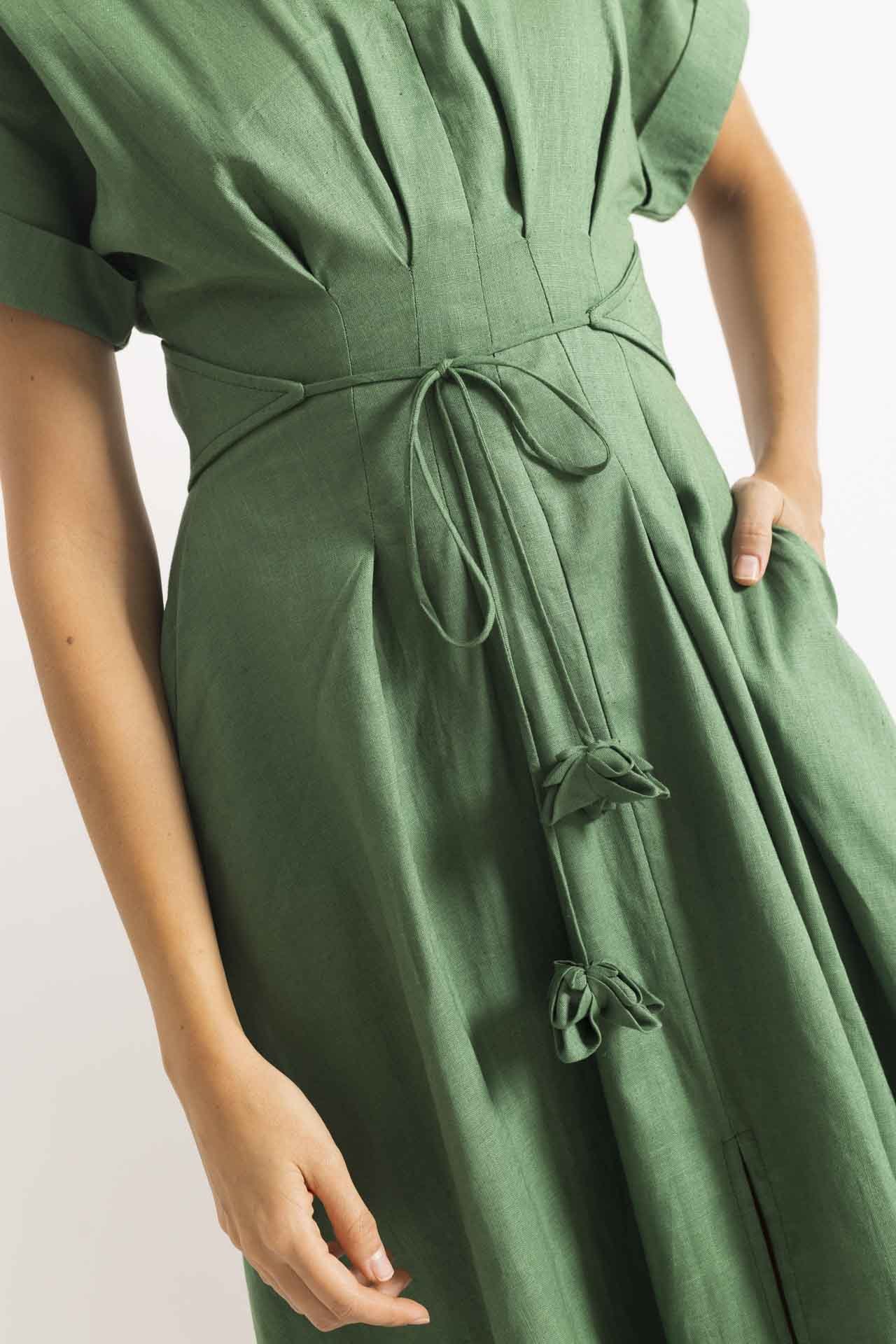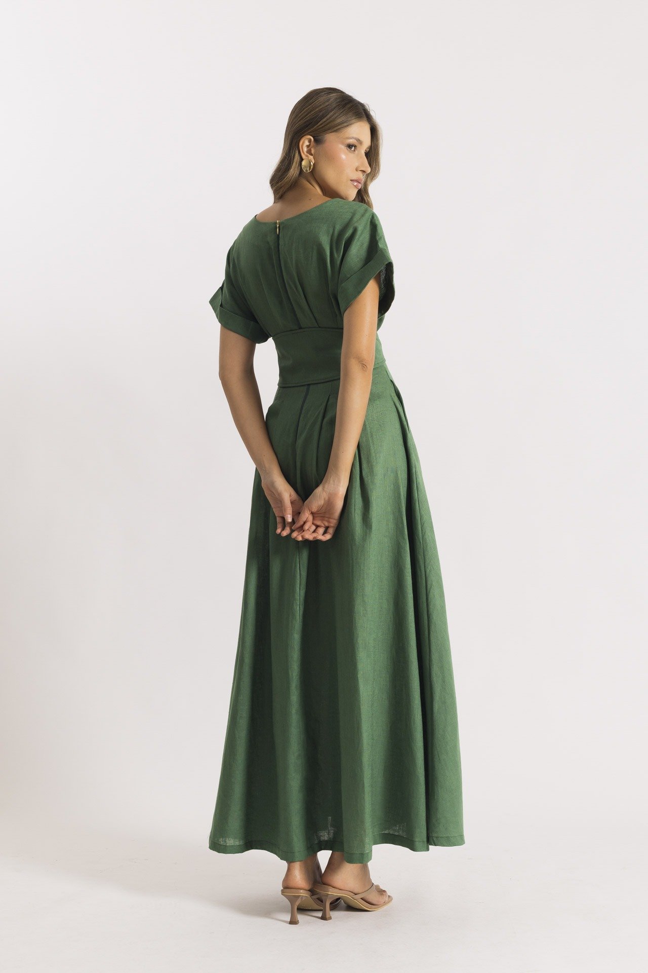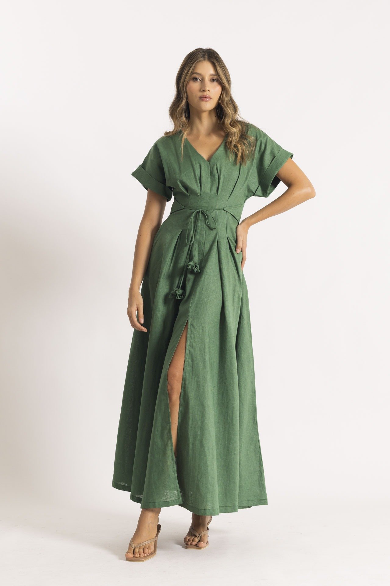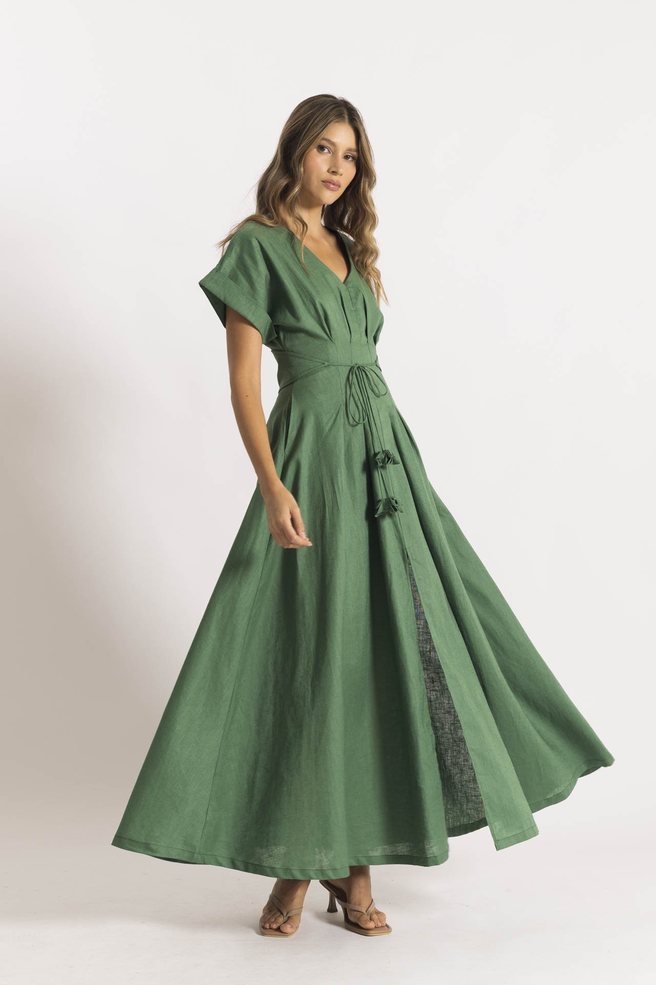 El Vestido Clio largo color verde irradia frescura y elegancia natural. Confeccionado en lino ligero, destaca por su escote en V, mangas pasadas y pliegues en la cintura que dan forma a una falda amplia con abertura central. Su cinturón removible con borlas florales hechas a mano aporta un toque artesanal encantador. Perfecto para un matrimonio en la playa, una tarde de verano o una cita especial.
