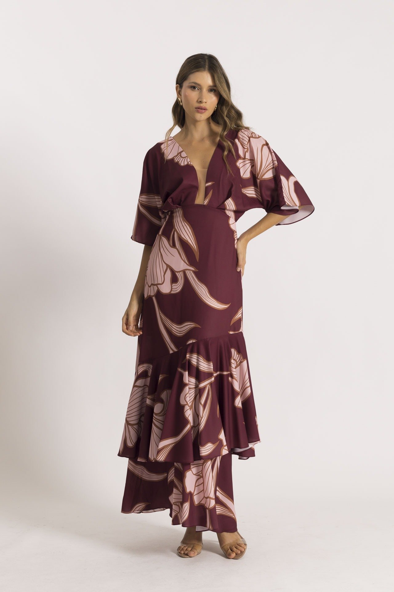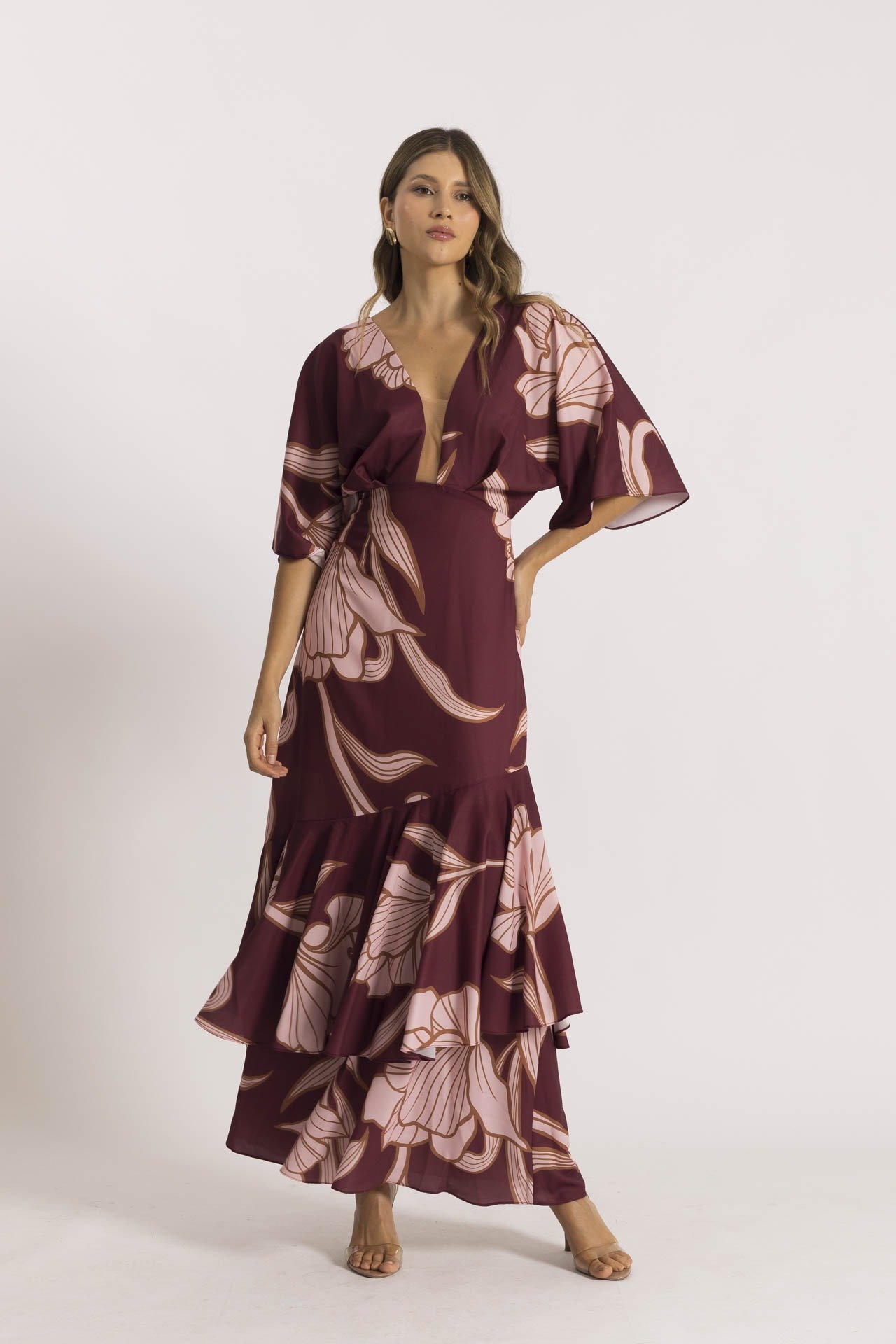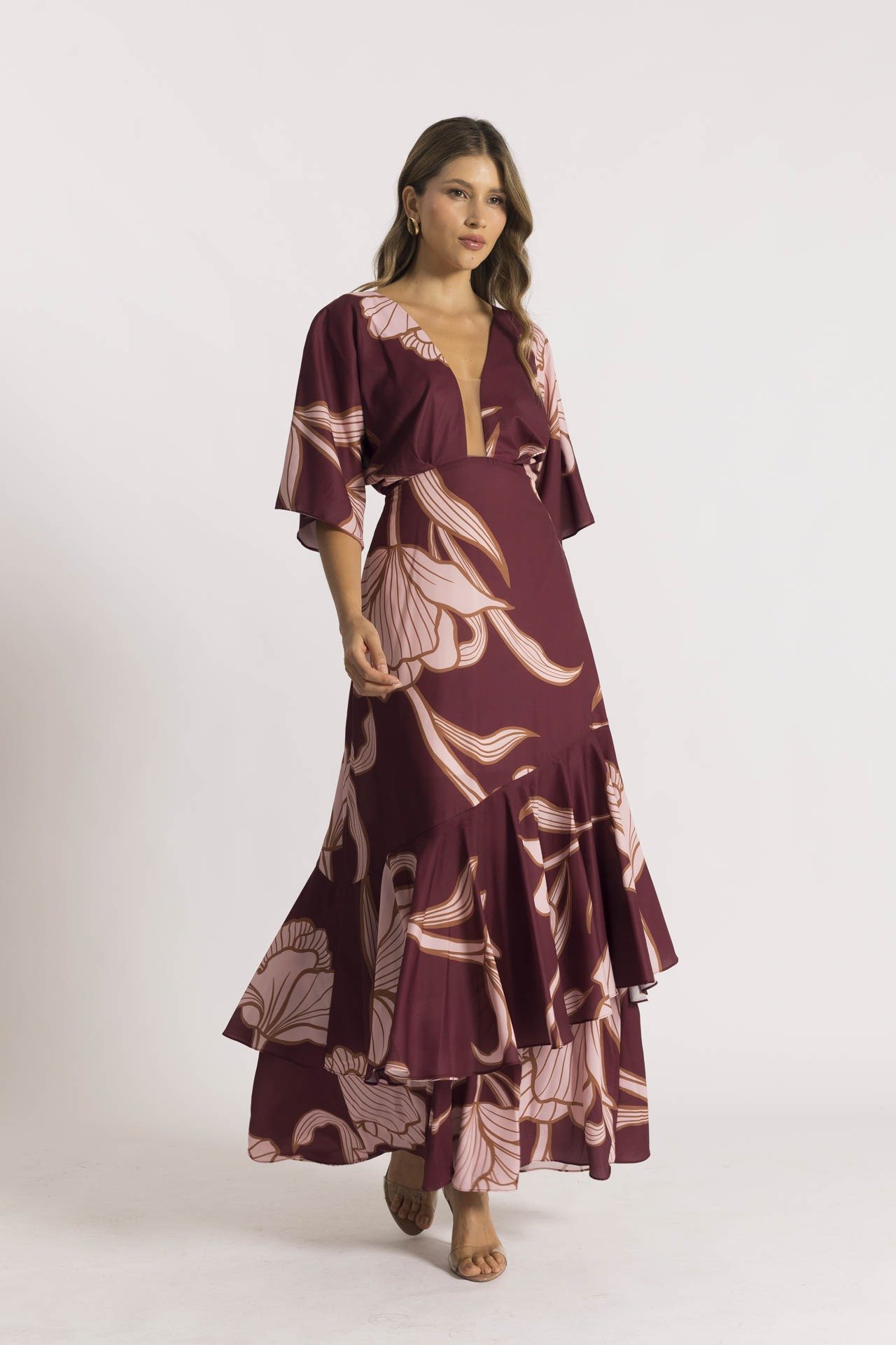 Este vestido, elaborado en seda, es ideal para ocasiones especiales. Su escote en V resalta de manera elegante, mientras que la falda, con su bolero incorporado, aporta un toque único. Las mangas tipo capa complementan perfectamente el diseño, ofreciendo fluidez natural y un encanto romántico, que se traduce en elegancia y comodidad. Un vestido que refleja distinción, perfecto para quienes buscan un look sofisticado y lleno de estilo.