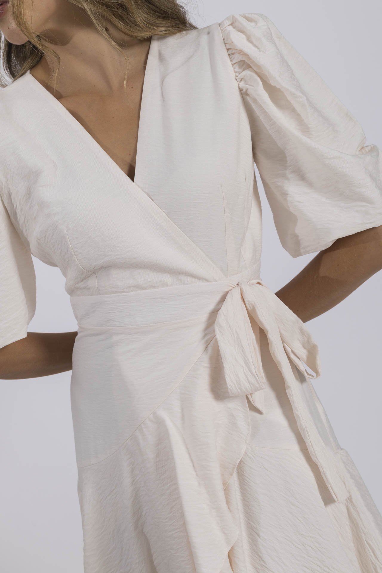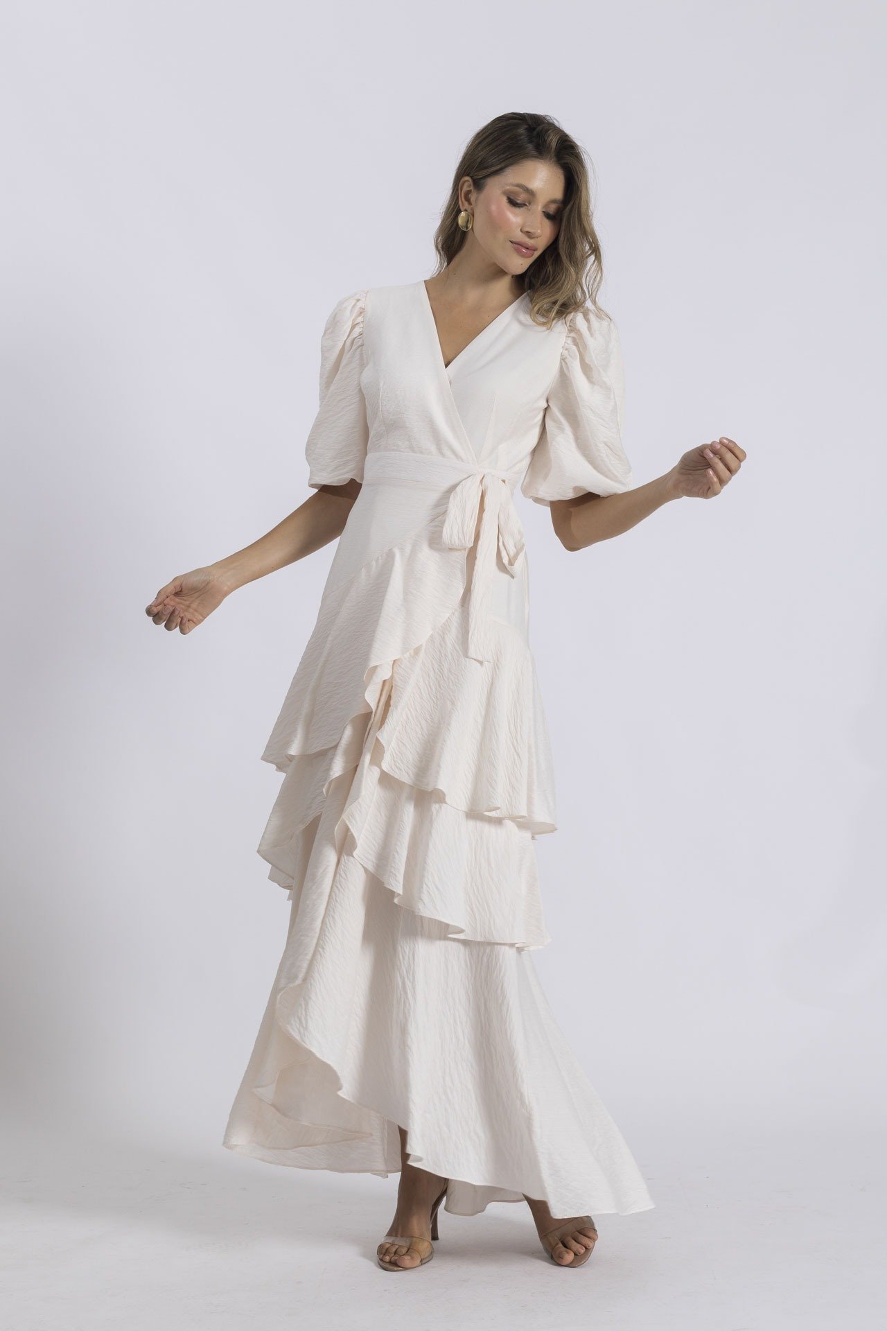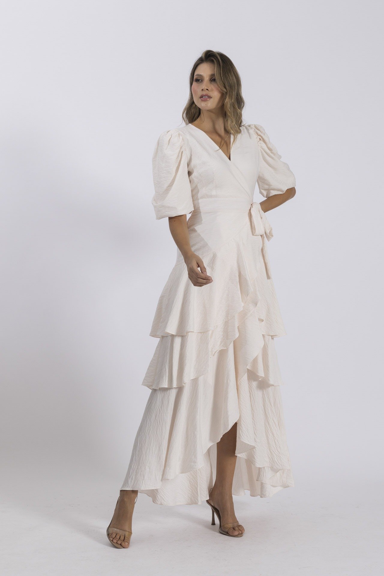 La clásica y atemporal silueta envolvente se hace presente en nuestro hermoso vestido Emilia. Un romántico vestido con sus boleros en falda que le añaden mucho movimiento y mangas puff que lo convierten en una maravillosa opción para tu fiesta blanca o tu momento especial. Úsalo con unos delicados accesorios dorados y tacones nude para verte sublime.