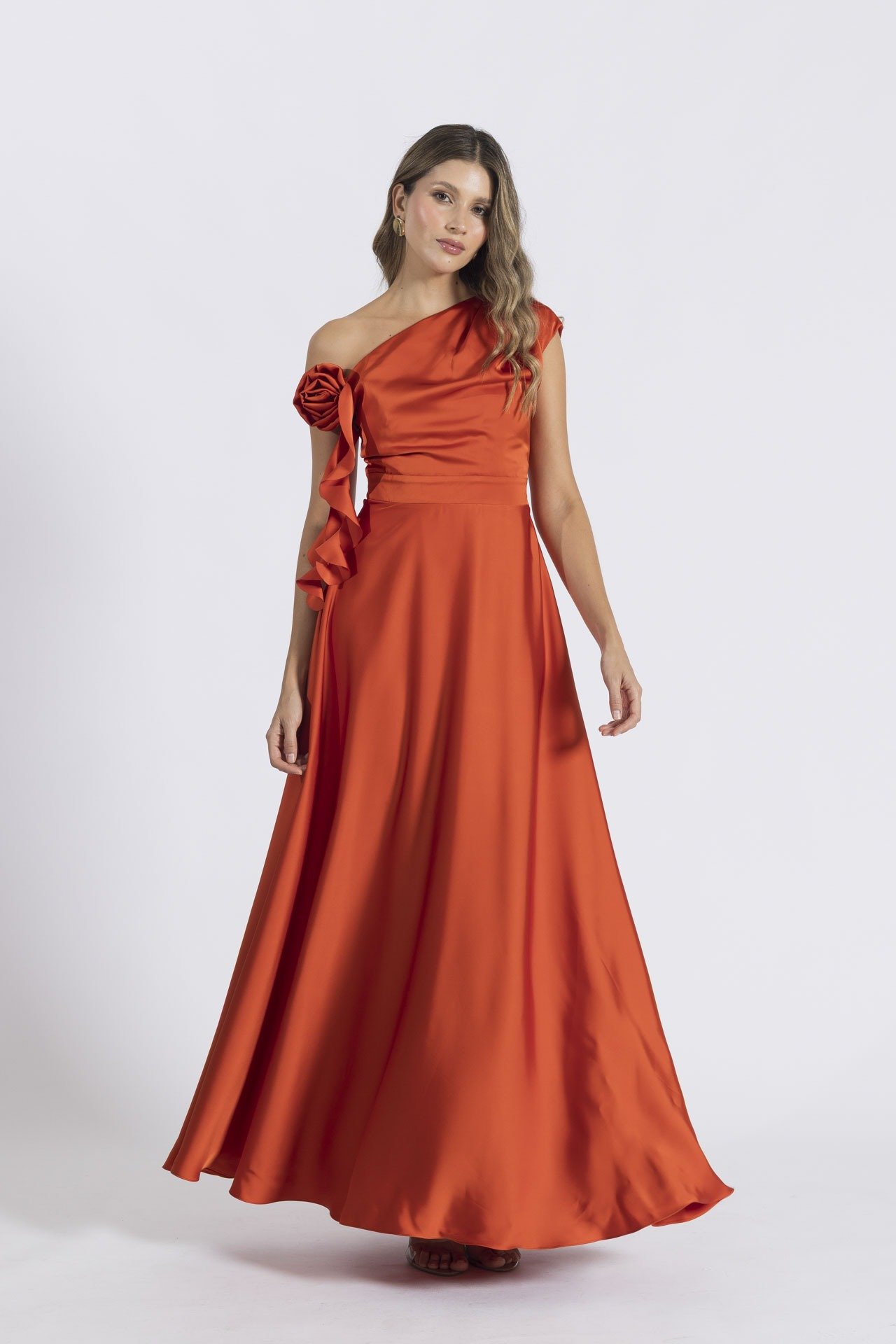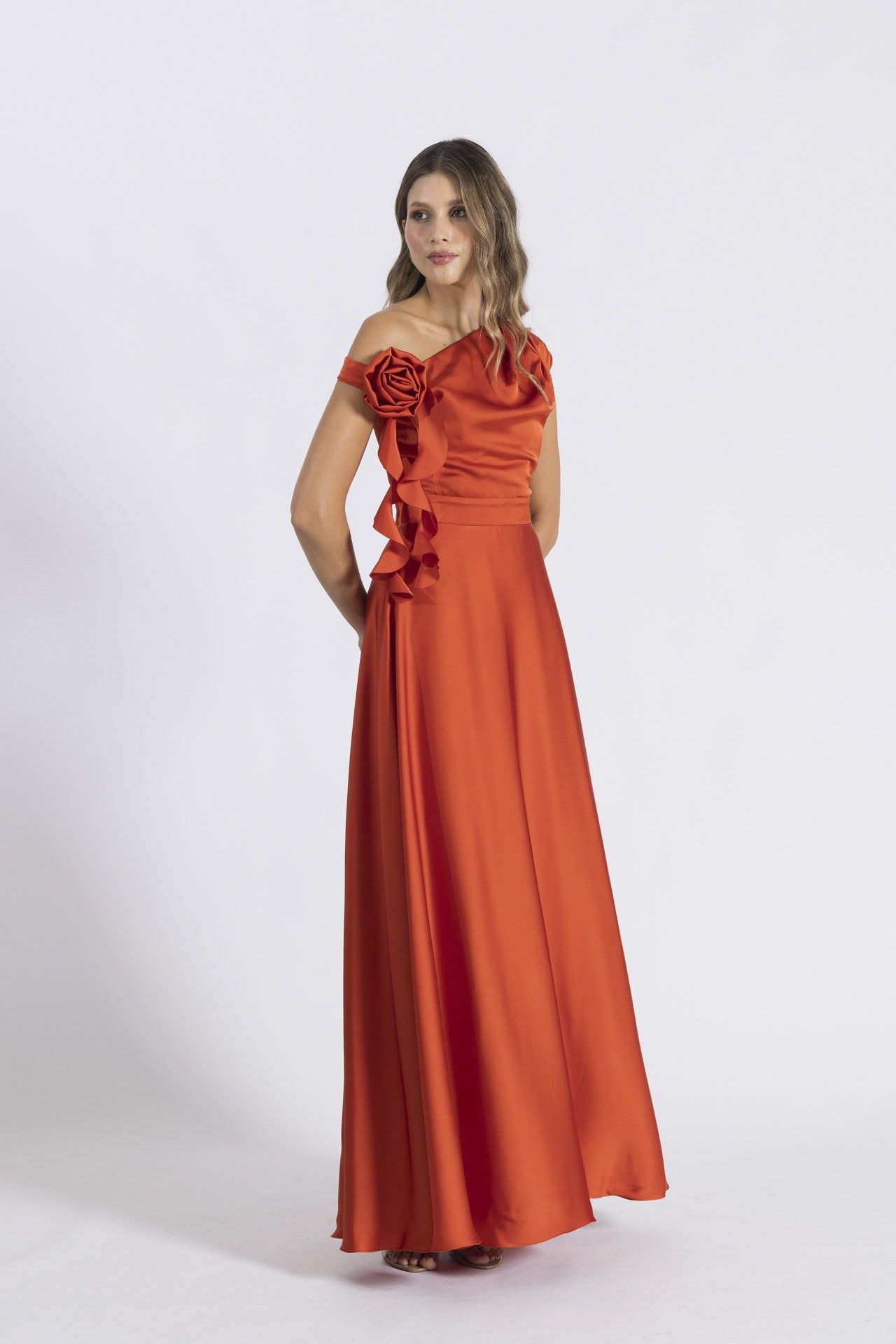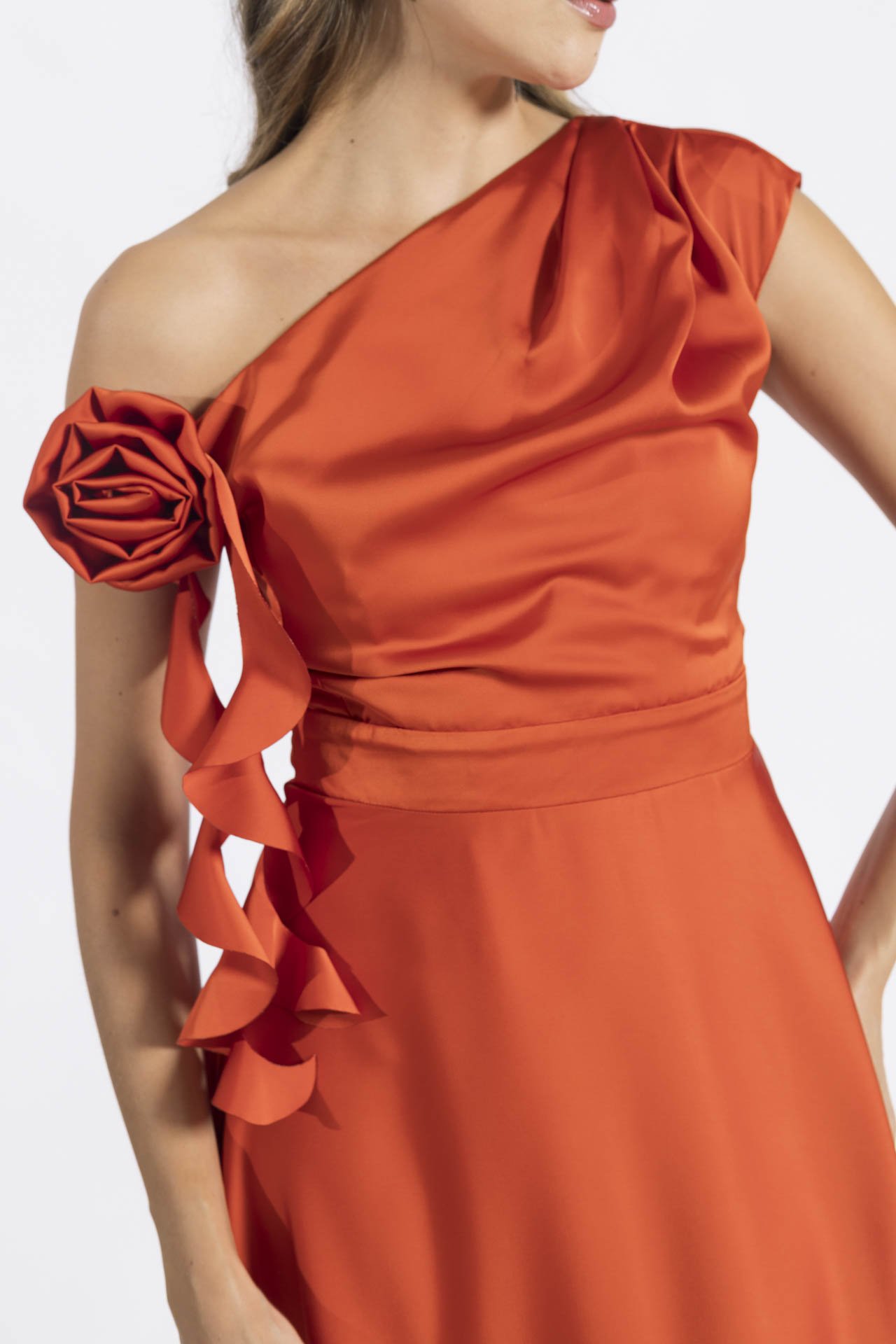 Este vestido, confeccionado en seda satinada, es una verdadera obra de arte. Su escote asimétrico con detalle drapeado realza la elegancia natural, mientras que la flor elaborada en tela con corte láser en la parte del escote agrega un toque único y sofisticado.Ideal para eventos especiales donde deseas irradiar delicadeza y una elegancia inigualable, este vestido es la elección perfecta para quien busca destacarse con un estilo refinado y moderno. Su diseño impecable y detalles exquisitos convierten a esta prenda en una opción inconfundible para ocasiones donde cada mirada será cautivada. ¡Un vestido que redefine la sofisticación!