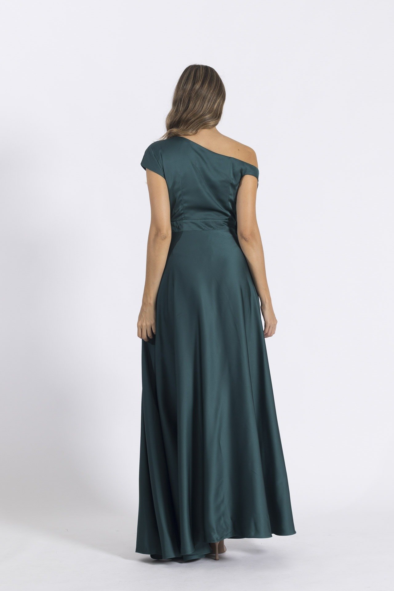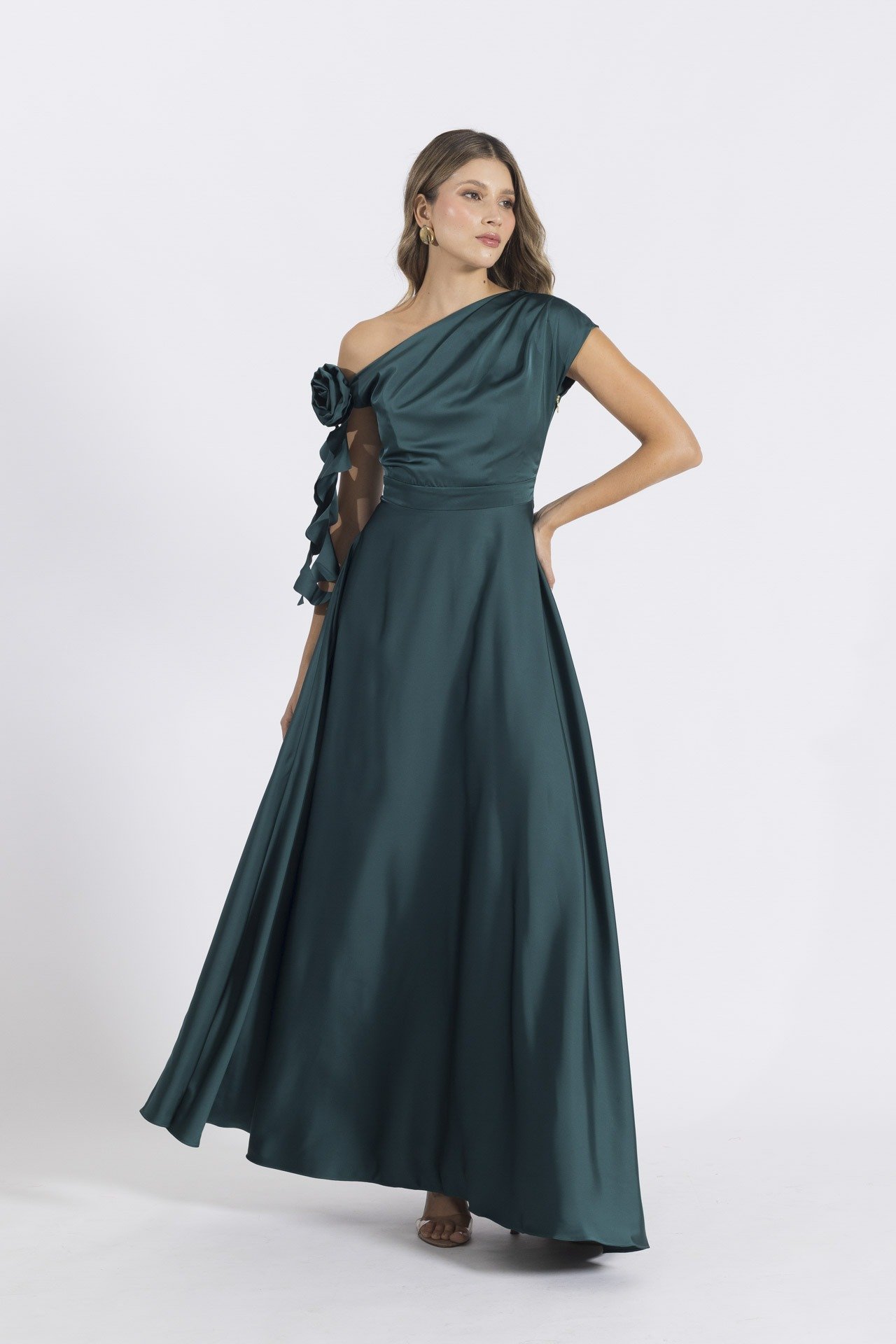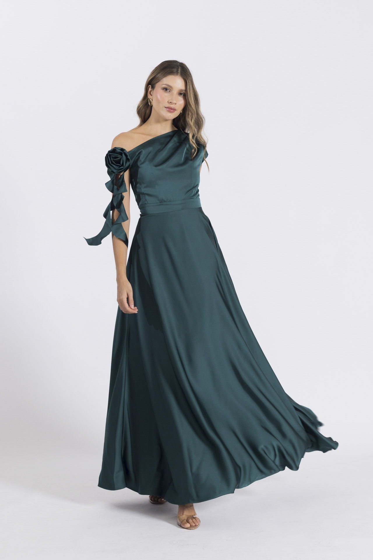 Este vestido, confeccionado en seda satinada, es una verdadera obra de arte. Su escote asimétrico con detalle drapeado realza la elegancia natural, mientras que la flor elaborada en tela con corte láser en la parte del escote agrega un toque único y sofisticado.Ideal para eventos especiales donde deseas irradiar delicadeza y una elegancia inigualable, este vestido es la elección perfecta para quien busca destacarse con un estilo refinado y moderno. Su diseño impecable y detalles exquisitos convierten a esta prenda en una opción inconfundible para ocasiones donde cada mirada será cautivada. ¡Un vestido que redefine la sofisticación!