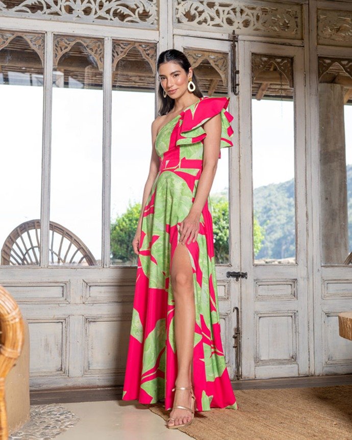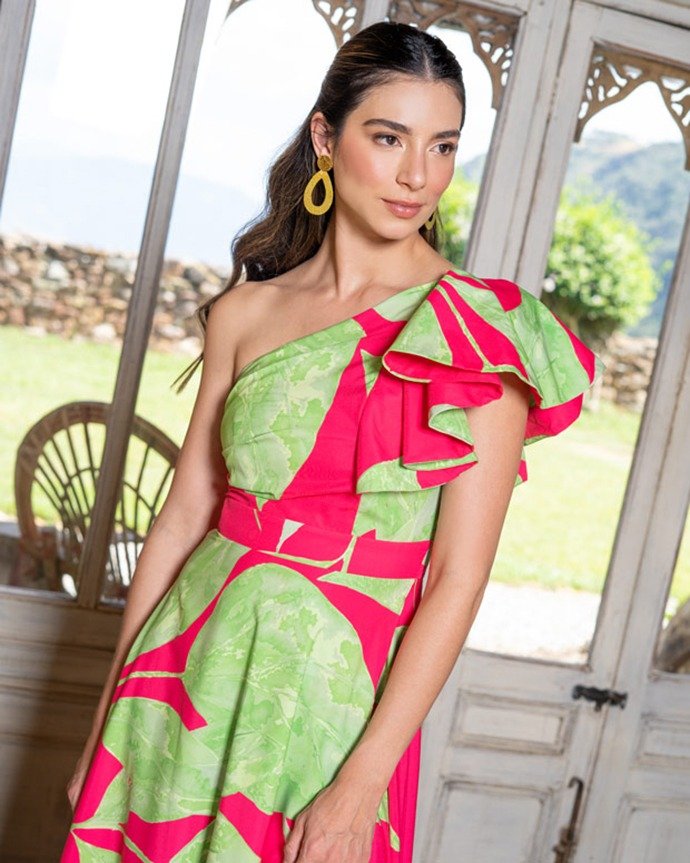 Nuestro vestido Frida llega en un vibrante estampado, para llenar tus momentos especiales de estilo y sutil sensualidad, su escote medio beso y manga con bolero sumado a su amplia falda con abertura resaltarán tu figura de una forma increíble. Úsalo con tus tacones favoritos y unos aretes grandes dorados y estarás lista para impactar. Vestido elaborado en tela con un ligero strech.