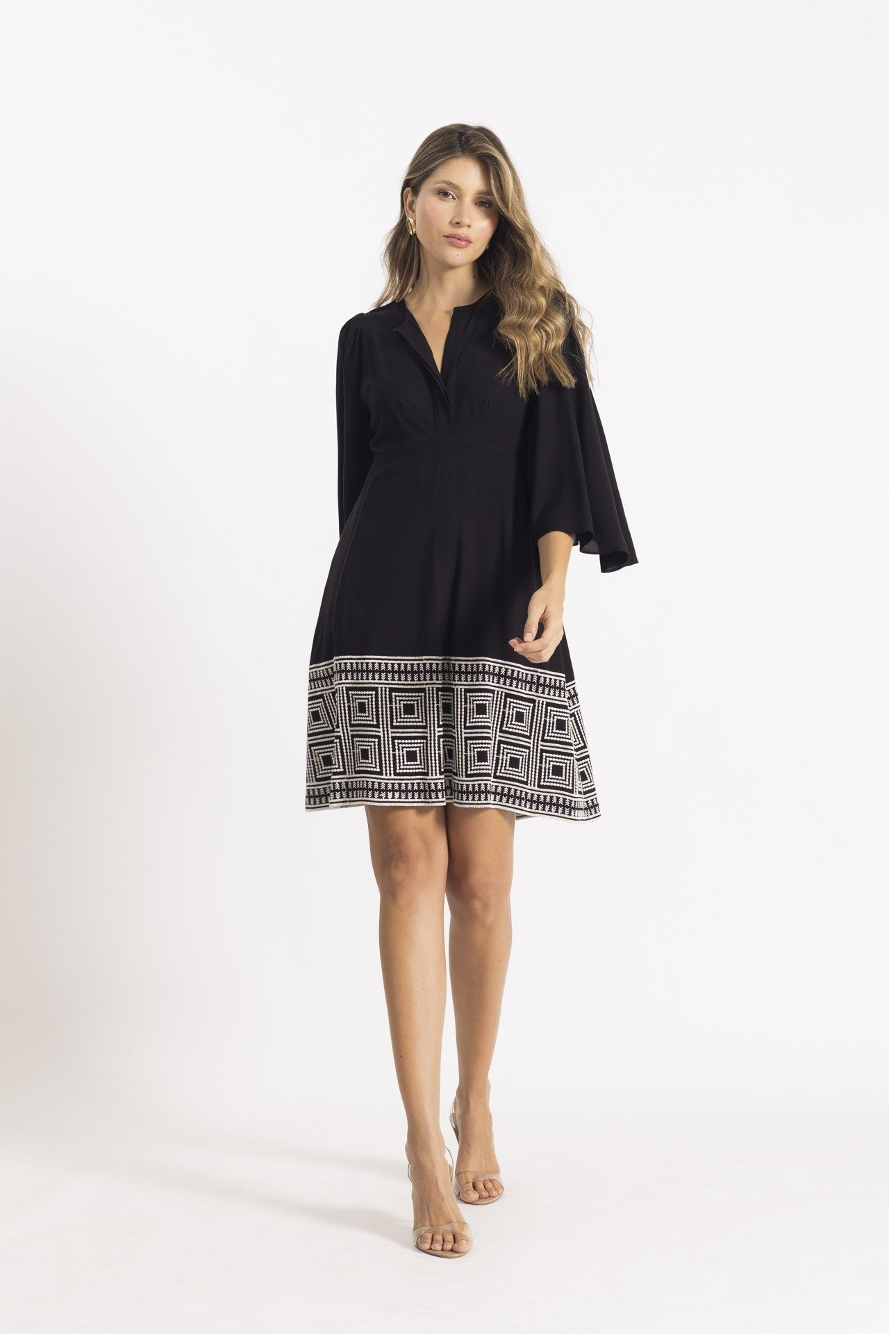 Este vestido, elaborado en suave rayón natural, es la definición de frescura y estilo casual. Su diseño pensado para el día a día combina comodidad y detalles encantadores que lo hacen especial, un delicado bordado en el zócalo que aporta un toque artesanal y único, y un escote en V con un botón forrado que enmarca sutilmente.