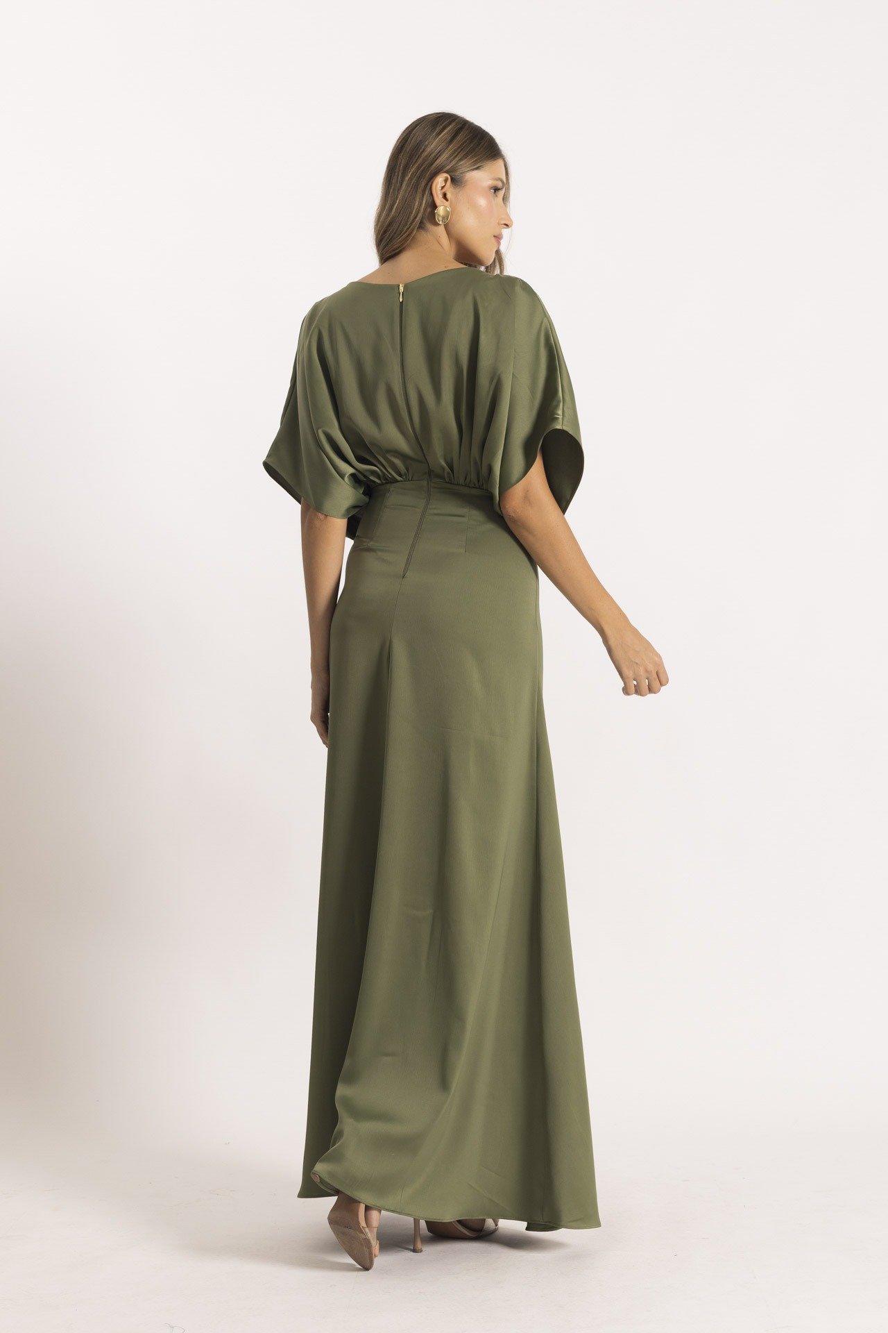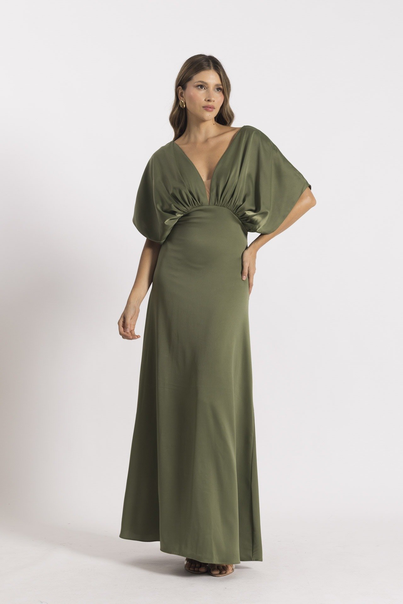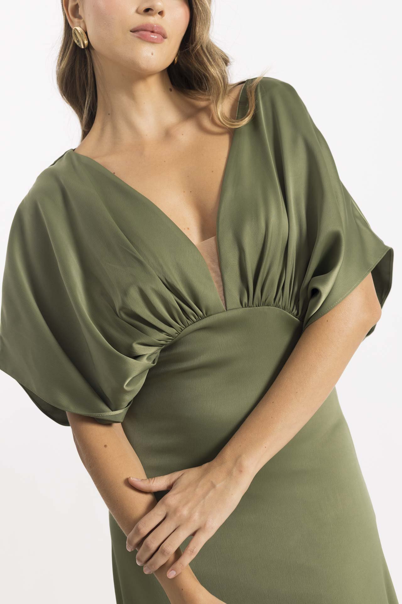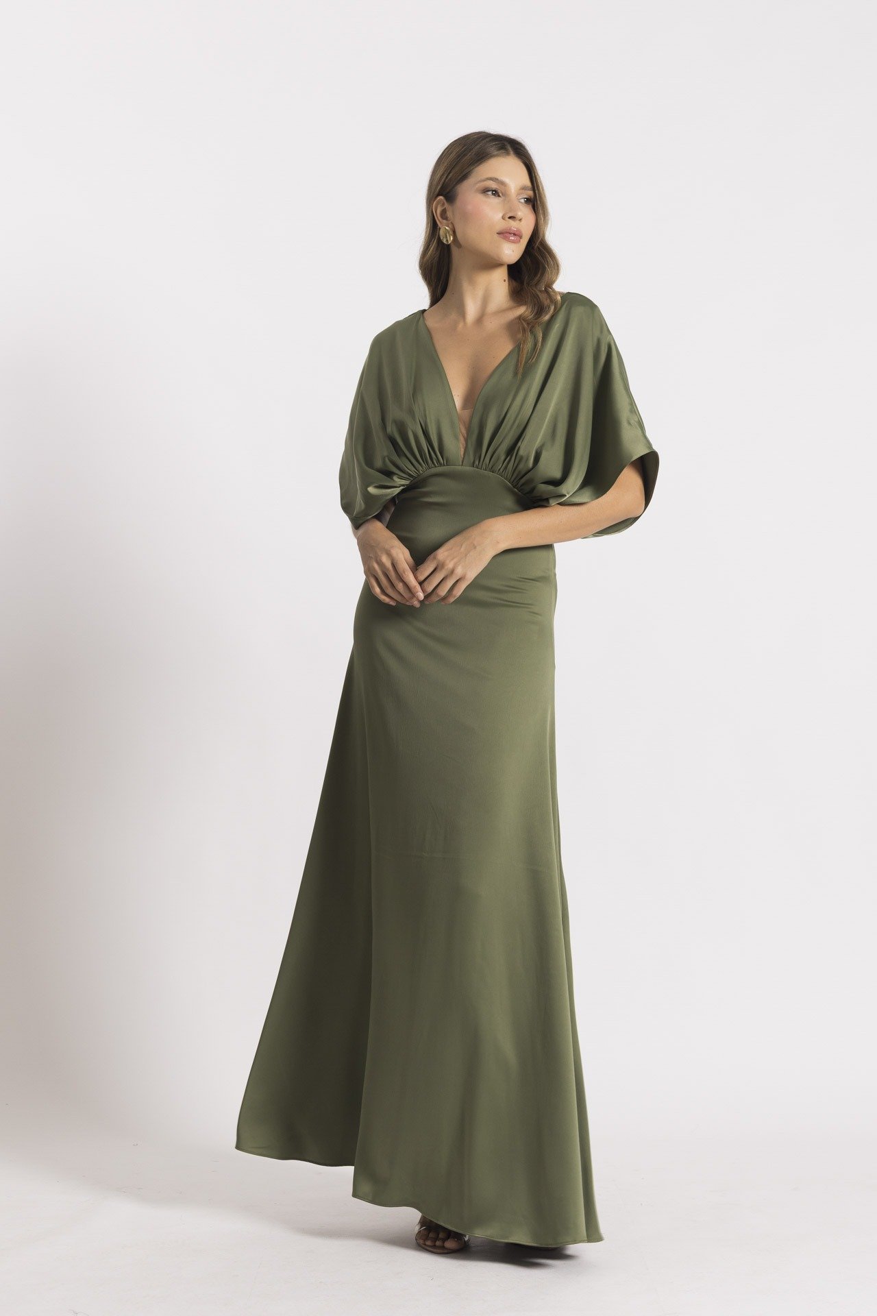 El vestido Hortensia verde oliva destaca por su escote en V profundo, sutilmente cubierto con una delicada malla color piel, y mangas tipo murciélago que aportan fluidez. Su silueta semi ajustada brinda comodidad sin perder sofisticación, ideal para eventos donde el estilo relajado también es protagonista. El toque final lo da su print en acuarela: único, auténtico y lleno de personalidad.