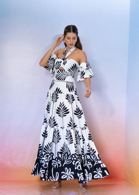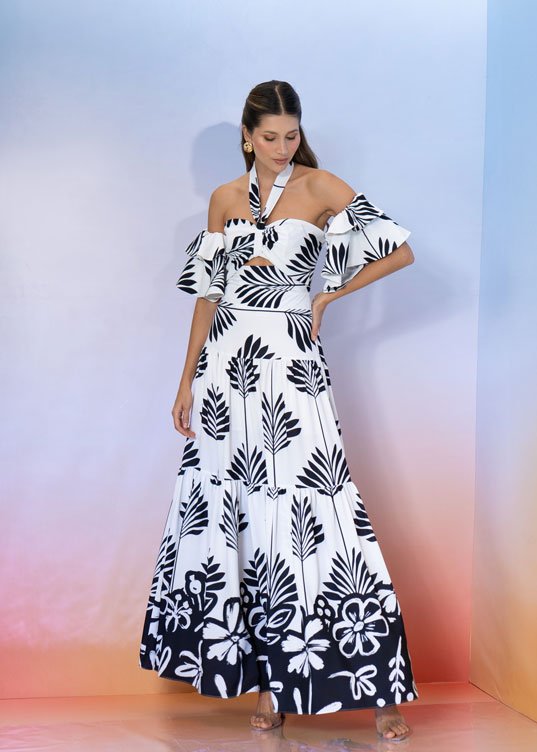 Este vestido combina comodidad, encanto y sofisticación en una sola prenda. Con boleros en las mangas que añaden un toque de volumen y una falda en bloques que proporciona mucho movimiento, tu figura se verá espectacular. Su escote halter, que termina en un delicado cordón alrededor del cuello, aporta un toque sutil, el estampado maravilloso y su sócalo en contraste armonizan perfectamente, dándole un aire alegre y diferente. Confeccionado en tela con un ligero strech, este vestido es perfecto para tu día a día o para un viaje a la playa, brindándote comodidad y estilo en cada momento.