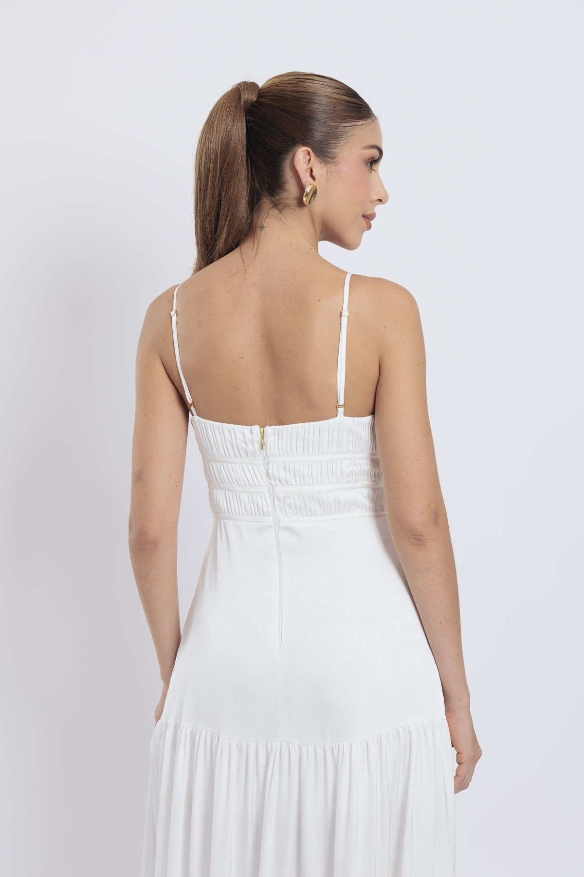 El vestido Ivette destaca por su escote plisado, que aporta textura y un toque distintivo al diseño. La falda con bloques de glas fruncidas le da movimiento y volumen, mientras que los bolsillos laterales y las tiras graduables lo hacen práctico y cómodo, adaptándose perfectamente al cuerpo. Con una tela de brillo sutil y textura arrugada, es una opción ideal para un matrimonio en la playa, un evento formal o cualquier ocasión especial donde quieras lucir fresca y elegante.