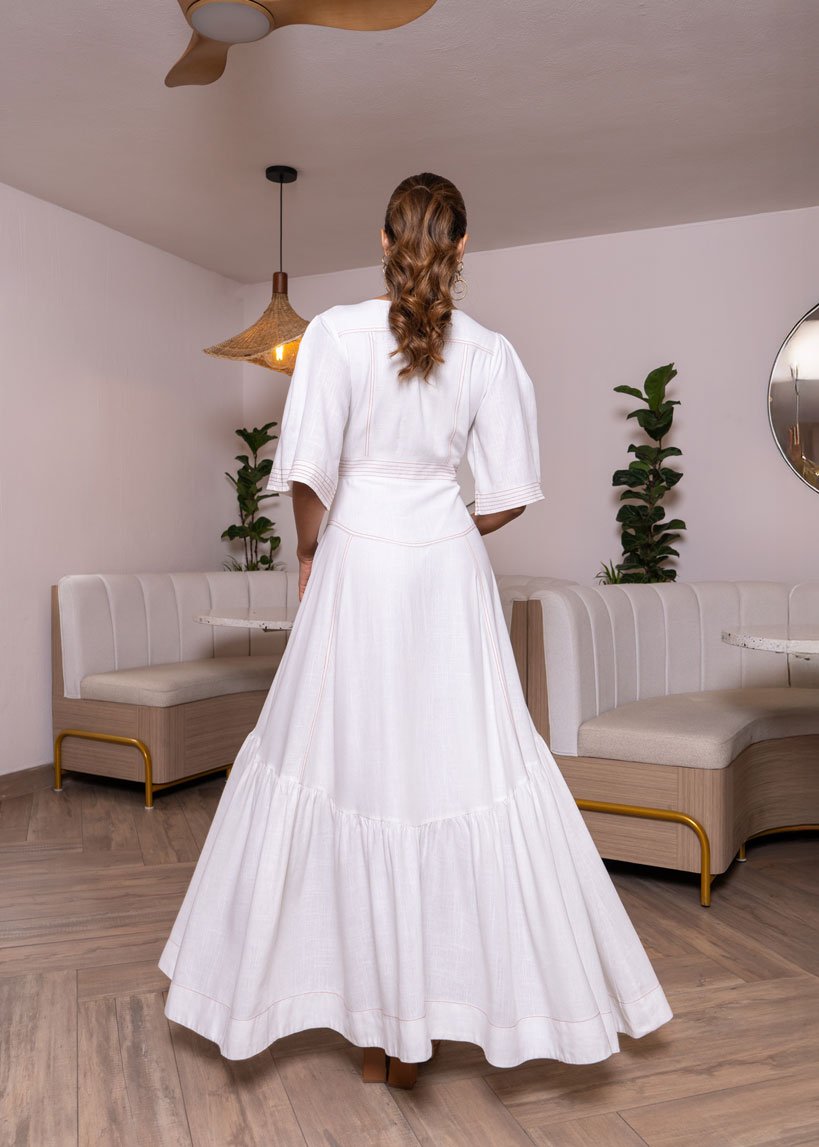 Este vestido, elaborado en lino rayón, es la perfecta combinación de versatilidad, confort y estilo. Su cierre con botonera frontal le otorga un aire moderno y dinámico, mientras que las costuras en tono a juego en el escote, la cintura y las mangas añaden un toque de distinción que eleva el diseño.