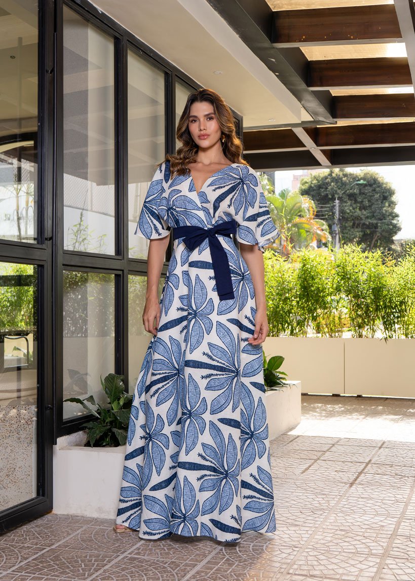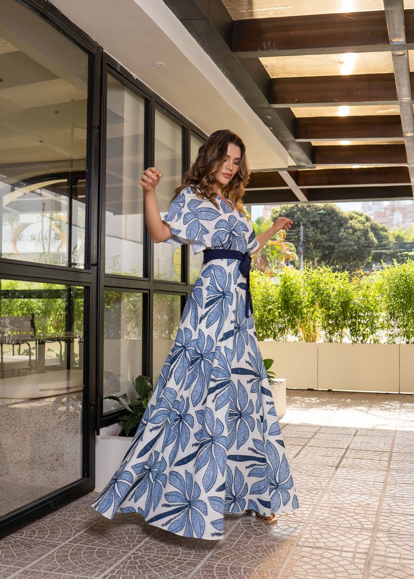 Elaborado en lino estampado, falda rotonda forrada, manga amplia, cremallera en el centro de la espalda con cinturón removible.