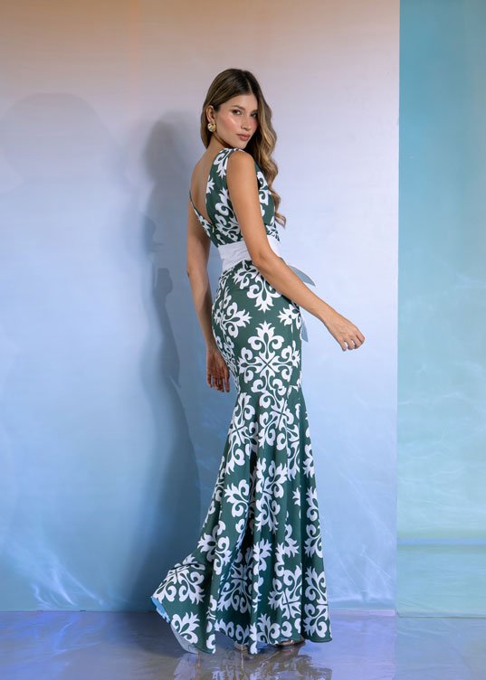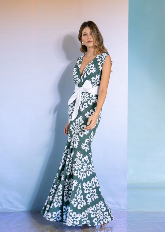 Vestido elaborado en seda estudio mate, escote en v, falda ceñida con corte sirena, cinturón elaborado en algodón, con costuras detalladas, espalda con escote en V.