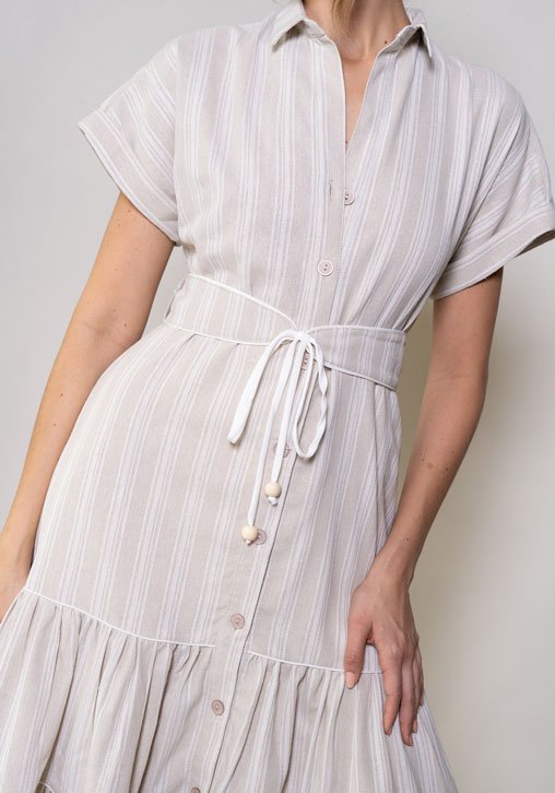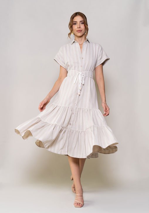 Este vestido de estilo casual es la opción perfecta para quienes buscan comodidad sin perder el estilo. Confeccionado en un lino rayón, su cierre con botonera en el frente aporta un detalle práctico. Su diseño se caracteriza por un detalle de sesgo embonado en el cinturón y en los cortes de la falda que añade una dimensión sutil, mientras que las esferas en madera, colocadas estratégicamente en el cinturón, aportan un toque artesanal y natural. Este vestido es la elección perfecta para ocasiones especiales, combinando confort y estilo atemporal.