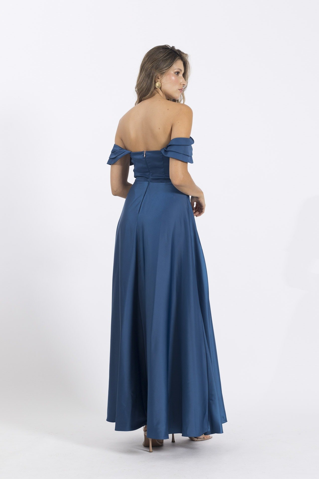 Vestido elaborado en seda satinada que deslumbra por su brillo sutil y elegante. Su escote barco realza la feminidad, mientras que las delicadas capas en las mangas añaden un toque romántico y sofisticado. La falda semi rotonda aporta volumen y movimiento, creando una silueta fluida y encantadora. Una prenda perfecta para destacar en eventos formales y noches especiales.