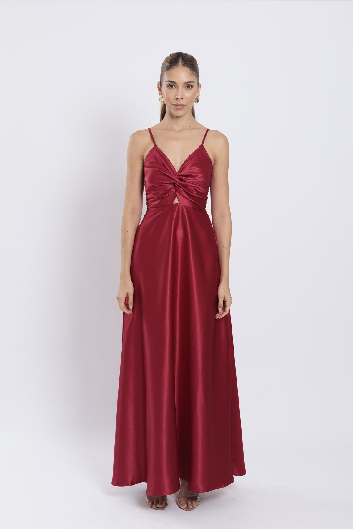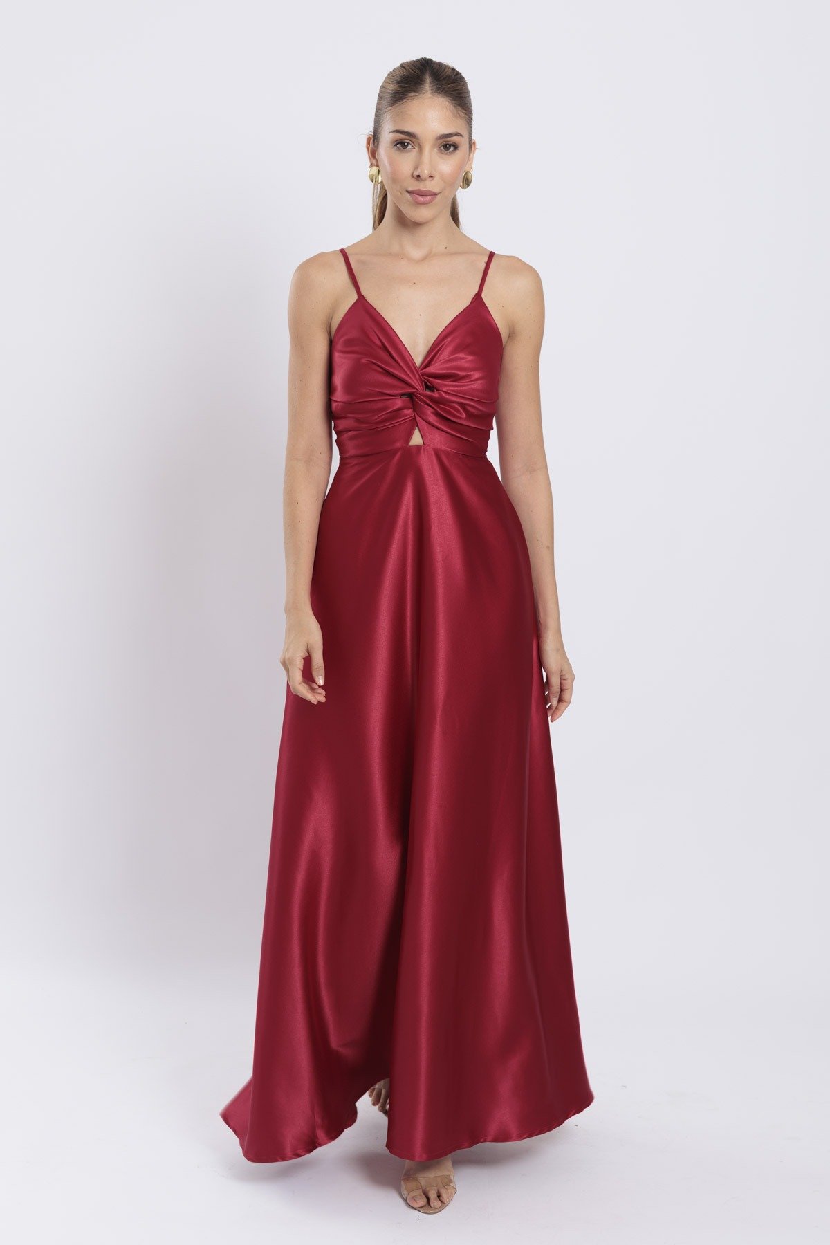 Vestido elaborado en seda, con escote delantero en nudo fijo, tirantes graduables, falda rotonda y cremallera en el centro de la espalda.