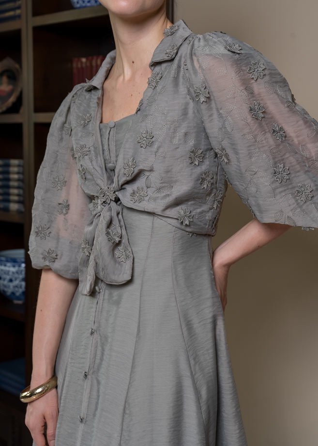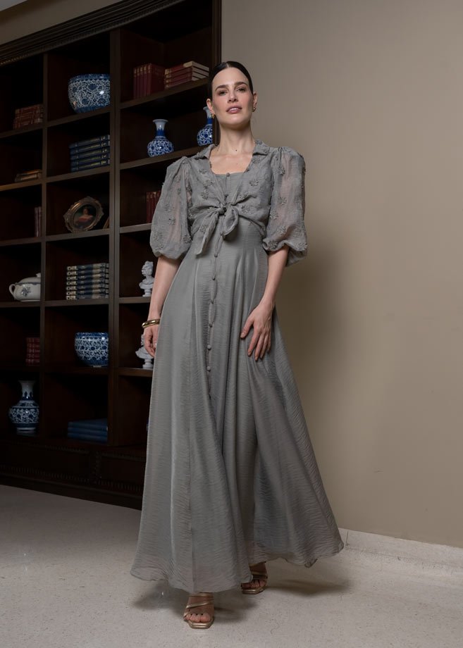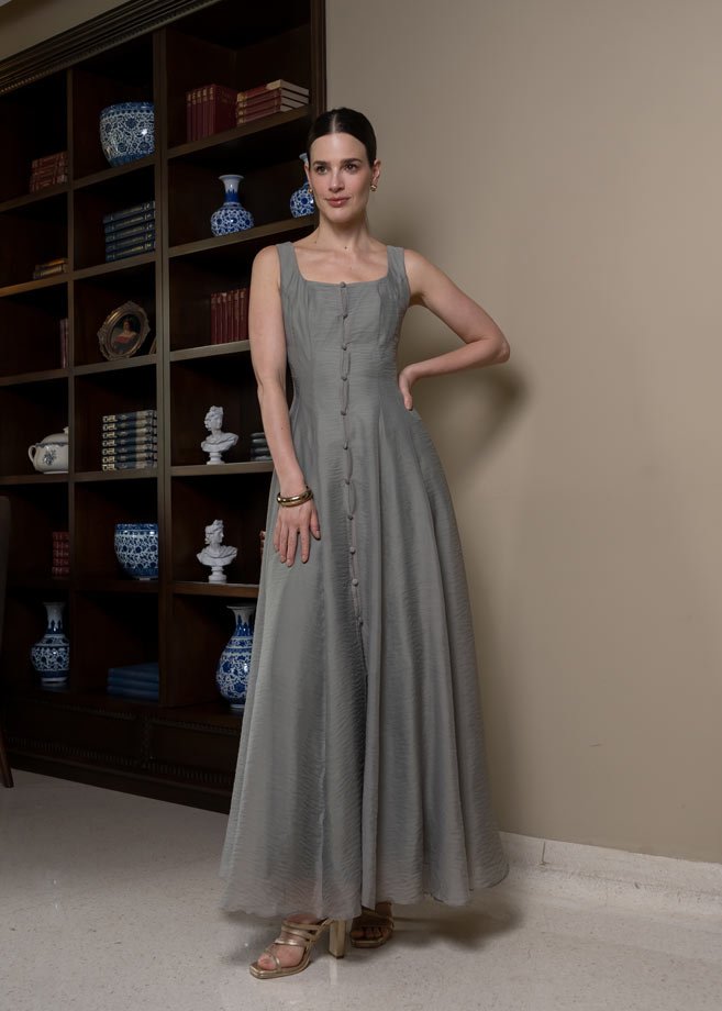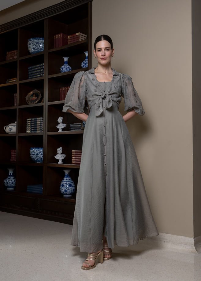 Mientras que los botones forrados al tono que recorren delicadamente la silueta, aportando un detalle artesanal que completa su estética bohemia. Una pieza que celebra la elegancia natural de la mujer, ideal para ocasiones especiales, encuentros memorables o simplemente para sentirte extraordinaria. Refinado, romántico y lleno de encanto este vestido no solo se lleva, se vive.